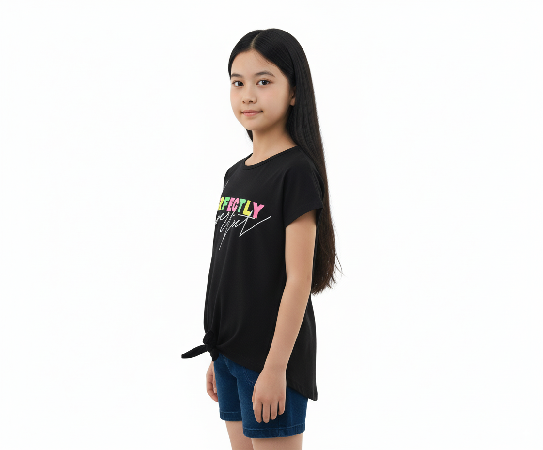 Girl's Front Tie With Perfectly Imperfect Print Round Neck Short Sleeve T-Shirt - Black