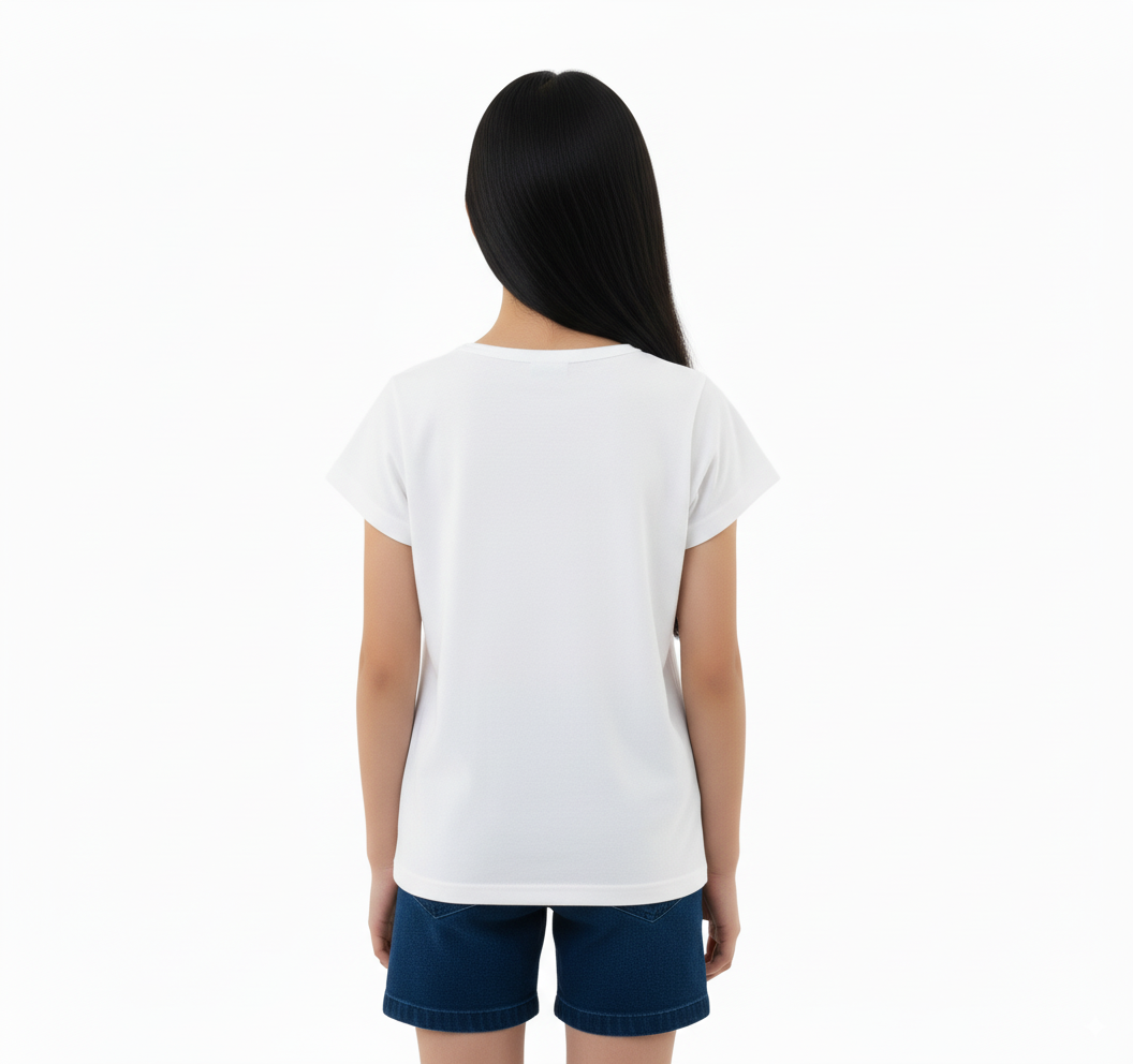 these girls' T-shirts. The round neckline is simple and generous, showing an