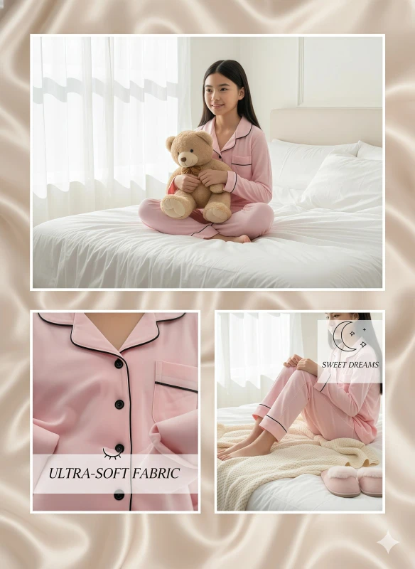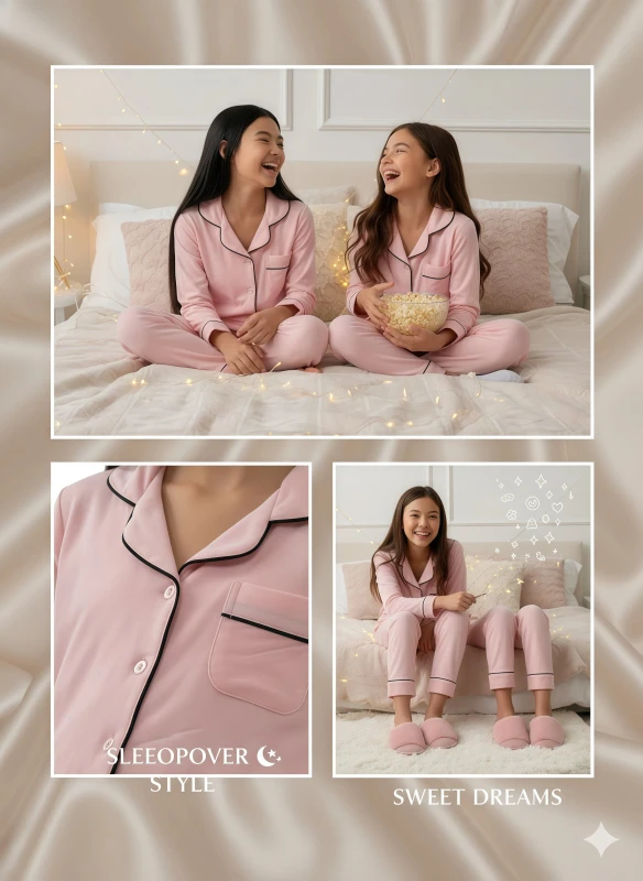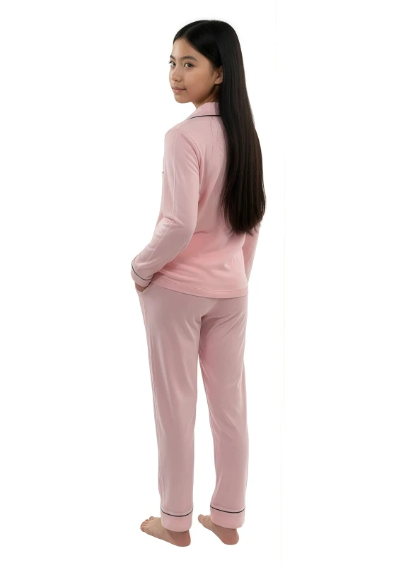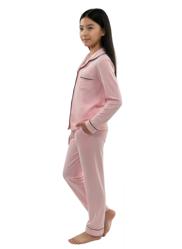 Drift off to dreamland in ultimate comfort and charming style with our delightful Pink Dreamland Pajama Set for young girls. This two-piece ensemble, crafted from an incredibly soft and breathable fabric blend, promises a night of peaceful sleep and relaxed mornings. The long-sleeved top features a classic button-down design, making it easy to slip on and off. Its elegant collar and cuffs are accented with a sophisticated black piping detail, adding a touch of timeless charm to the gentle pink hue. A functional chest pocket, also outlined with black piping, offers a convenient spot for small treasures or a tissue. The relaxed fit of the top ensures unrestricted movement, perfect for lounging or sleeping.