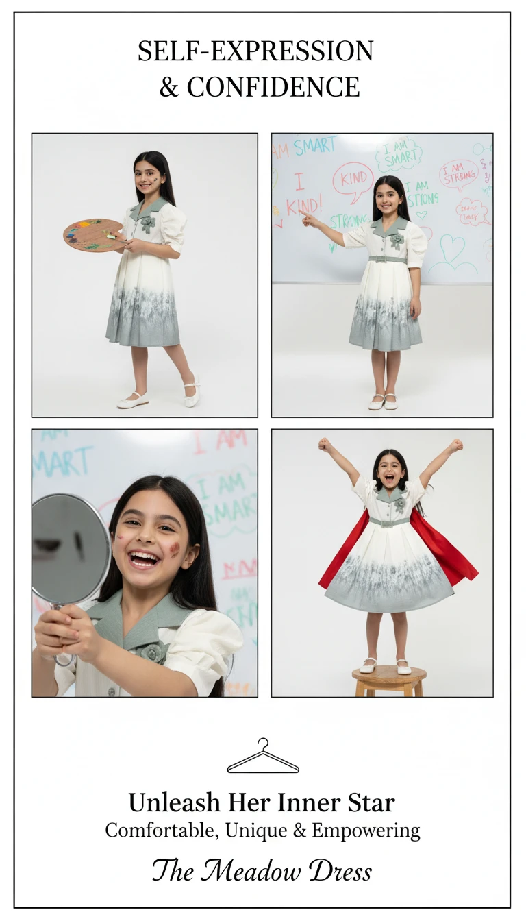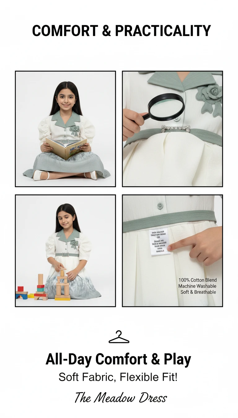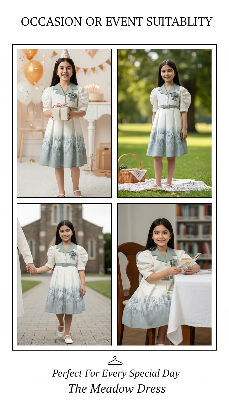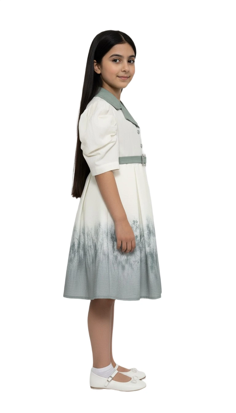 Step into a world of whimsical charm with our Enchanted Meadow Ombre Belted Dress. This unique and stylish dress features a pristine ivory bodice contrasted beautifully with a sage green lapel collar, creating a sophisticated two-tone effect. The elegant short puff sleeves add a touch of classic grace, while the matching sage belt, adorned with a dazzling diamond-encrusted buckle, cinches the waist for a flattering silhouette. The pleated skirt transitions from ivory to a soft sage ombre, highlighted by a delicate, nature-inspired print that evokes images of a serene meadow. A charming floral rosette and ribbon accent on the bodice complete this captivating design. Perfect for garden parties, family celebrations, or any occasion that calls for a blend of vintage elegance and contemporary flair.