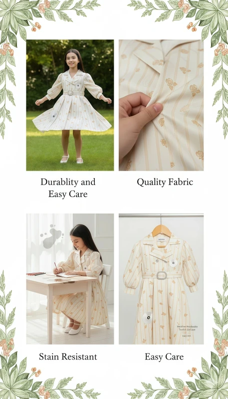 Designed with a sophisticated trench-style collar and a double-breasted button detail, this dress offers a refined silhouette. It features subtle vertical stripes and an all-over delicate rose print, creating a sweet and enchanting pattern. The unique puff sleeves with elasticized cuffs add a playful volume, while the dazzling embellished belt cinches the waist for a flattering fit. Two decorative floral appliqués on the skirt complete this distinctive look, making it perfect for spring events, parties, or stylish everyday wear.