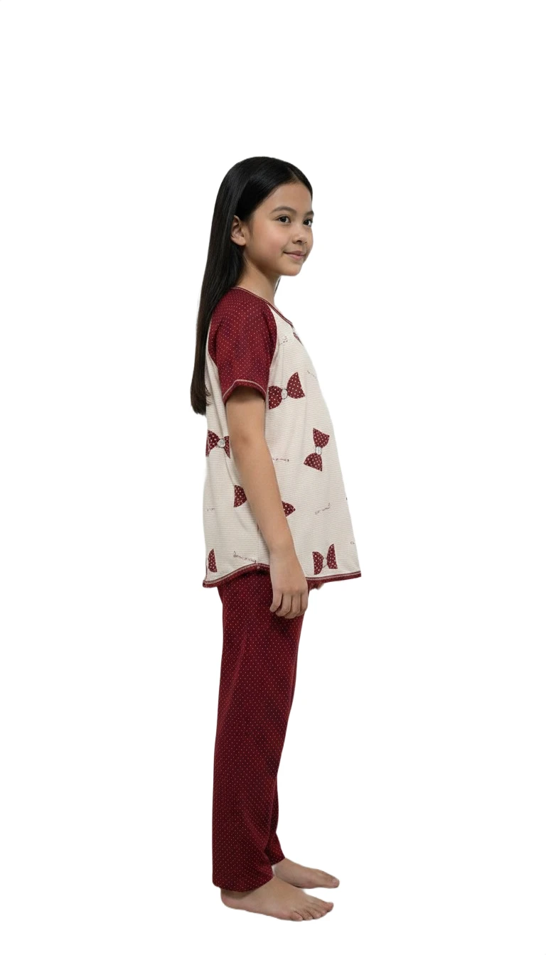 Bring a smile to her face and comfort to her nights with our Little Bow Sweetie Pajama Set. This adorable two-piece sleepwear set is crafted from a soft, gentle, and breathable fabric, perfect for sensitive skin and ensuring sweet dreams. The cream-colored raglan top features charming red bow prints and a cute "so cute" sentiment, complemented by a comfortable scoop neckline with a partial button placket. The matching full-length pants come in a lovely crimson red with a delicate polka dot pattern and a relaxed elastic waistband, allowing for unrestrained movement during sleep or playtime. Ideal for cozy bedtime stories, lazy weekend mornings, or simply lounging, this set combines playful style with supreme comfort for your little one.