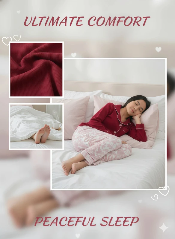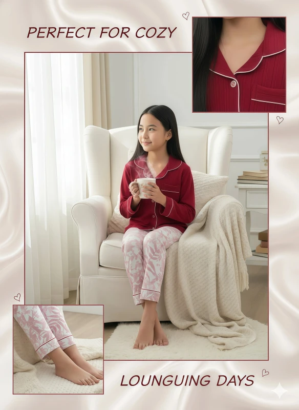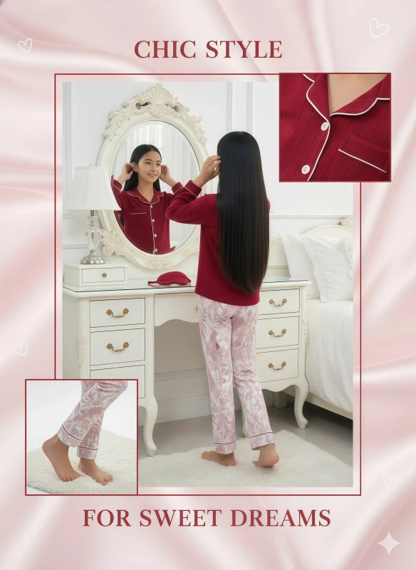 Embrace elegant comfort and charming style with our "Crimson Bloom" Pajama Set for young girls, a perfect blend of rich color and delicate pattern designed for blissful sleep. This exquisite two-piece ensemble, crafted from a wonderfully soft and breathable fabric blend, promises both warmth and comfort for restful nights and relaxed mornings. The long-sleeved top comes in a luxurious deep crimson, featuring a classic button-down front for easy wear. Its sophisticated collar and cuffs are beautifully highlighted with crisp white piping, adding a striking contrast and a touch of timeless elegance. A functional chest pocket, also adorned with matching white piping, offers a practical detail while maintaining the top's polished look. The fabric of the top has a subtle textured ribbed or striped pattern, adding depth and visual interest to the rich solid color.