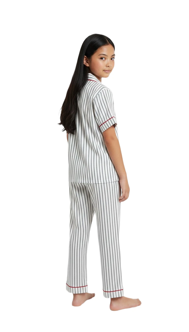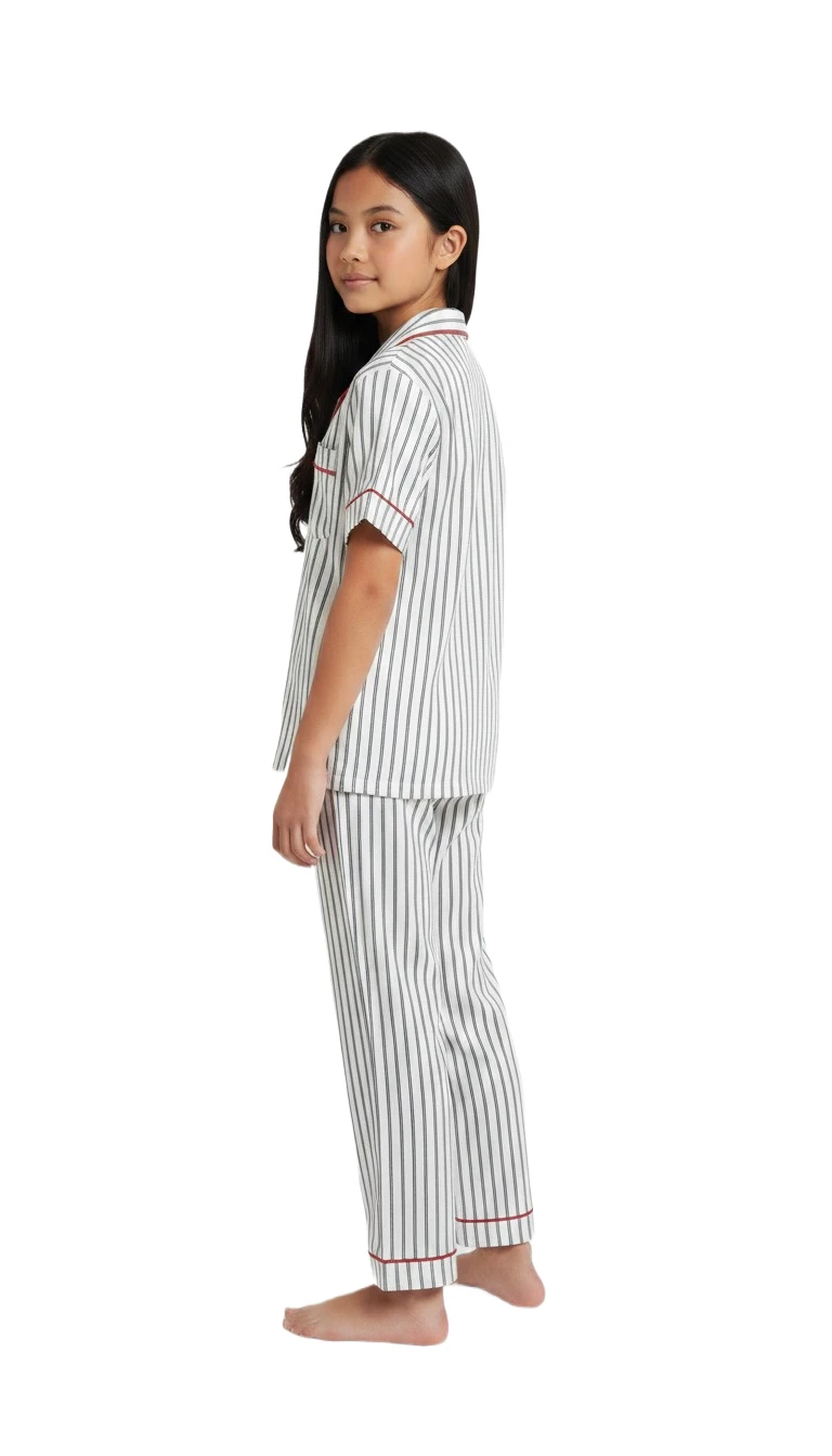 Introduce your little one to bedtime bliss with our enchanting Girls' Classic Striped Pajama Set. Crafted from soft, breathable fabric, this adorable two-piece sleepwear ensemble ensures maximum comfort for peaceful slumber and delightful morning lounging. The timeless vertical stripe pattern, accented with charming red piping along the collar, cuffs, and pockets, gives this set a sophisticated yet playful appeal. It features a short-sleeved, button-front top with a notched collar, perfectly paired with matching full-length pants that have a gentle elastic waistband for a snug, comfortable fit. Whether it's for sweet dreams, relaxed movie nights, or cozy breakfasts, this striped pajama set is designed for comfort, style, and endless happy moments.