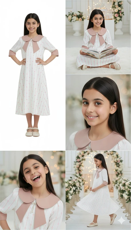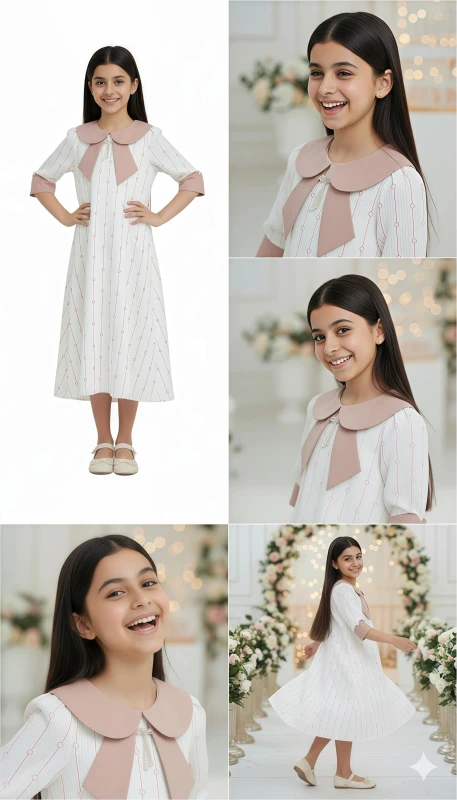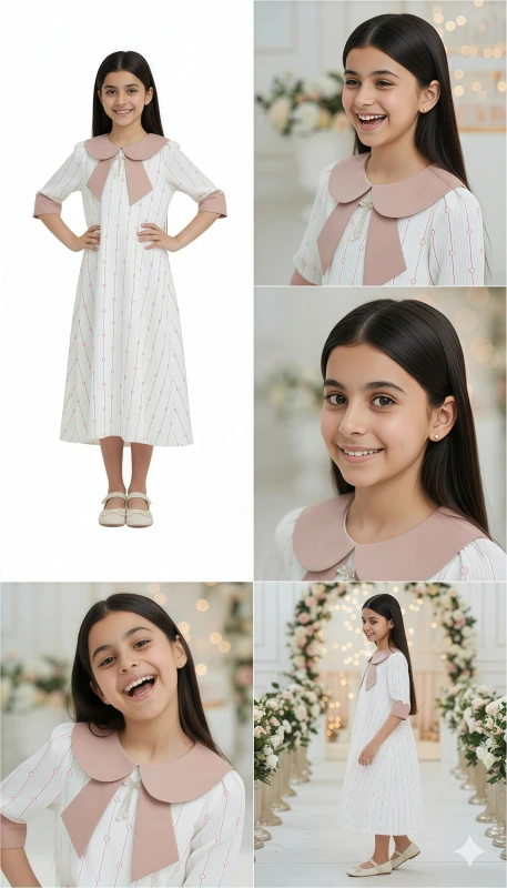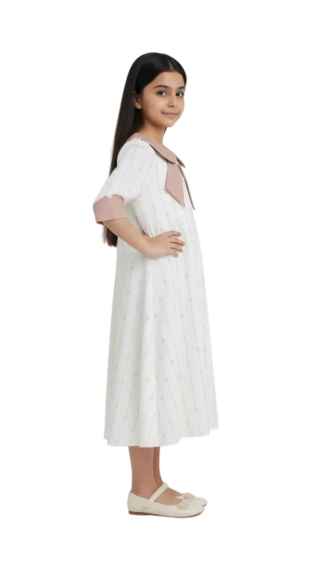 creating a whimsical pattern. A charming blush pink Peter Pan collar, accented