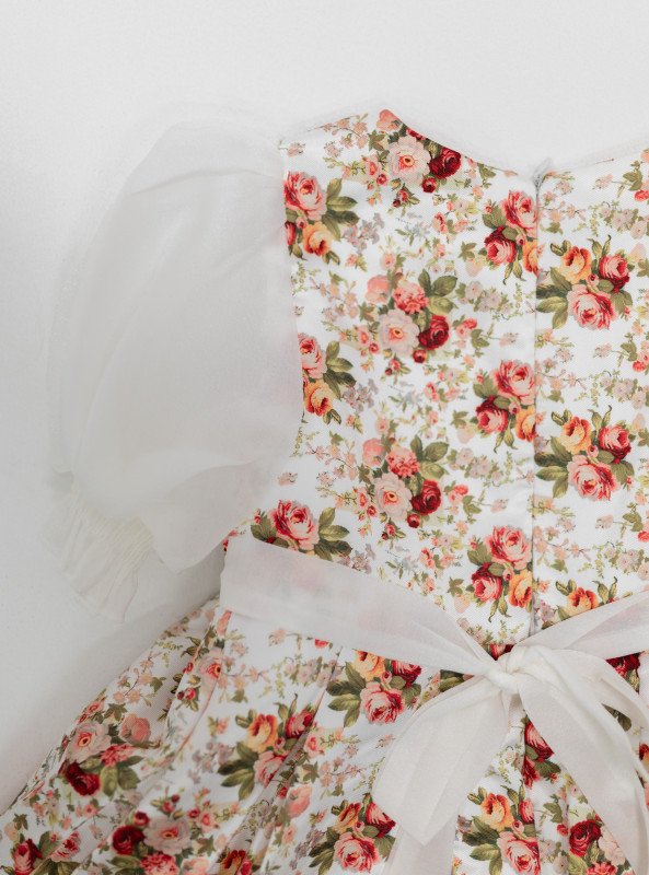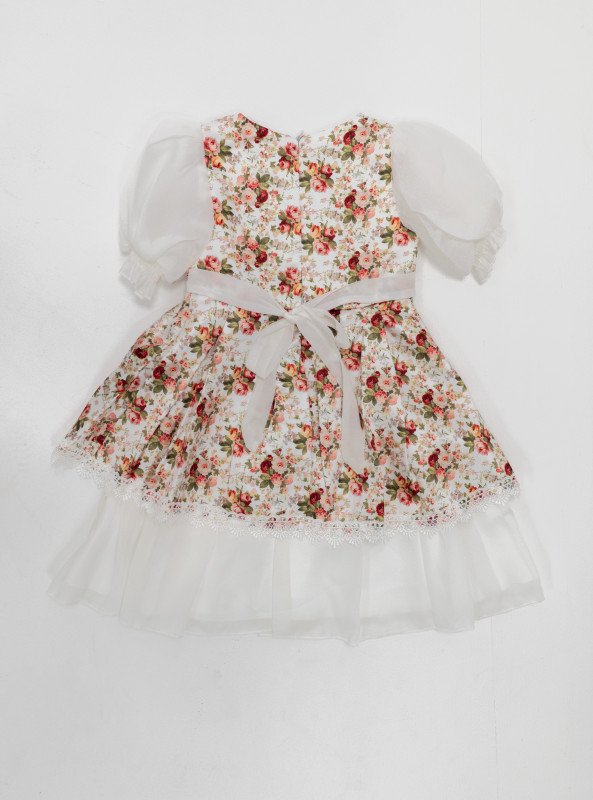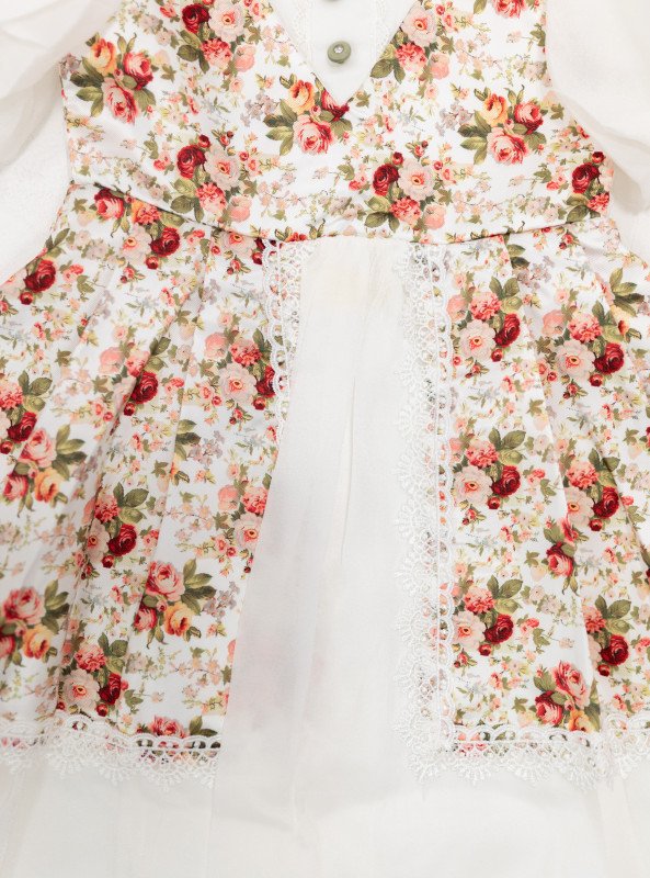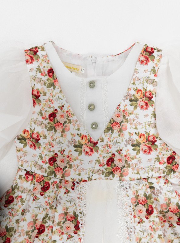 Capture timeless charm and youthful grace with this beautifully detailed vintage-inspired dress for girls. Featuring a classic puff-sleeve silhouette and layered skirt, this piece is adorned with an allover floral print in warm pink or orange tones. The delicate lace trim and decorative front buttons add to its old-world appeal, while the lightweight poly-blend fabric ensures comfort for all-day wear. Perfect for family gatherings, photo shoots, or garden parties, this dress blends elegance with playful flair.