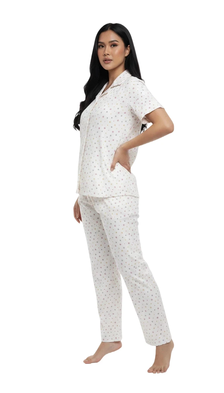 two-piece set features a short-sleeve button-up top with a classic collared