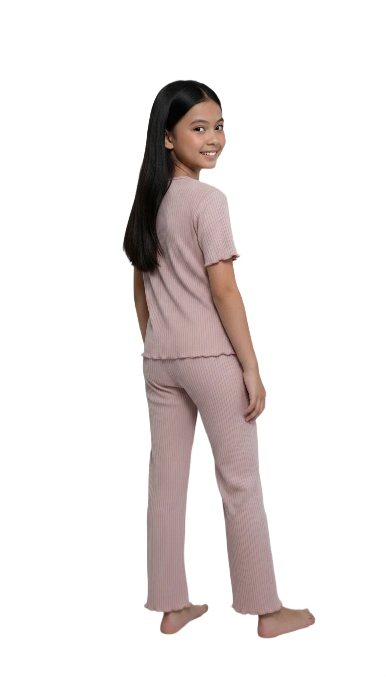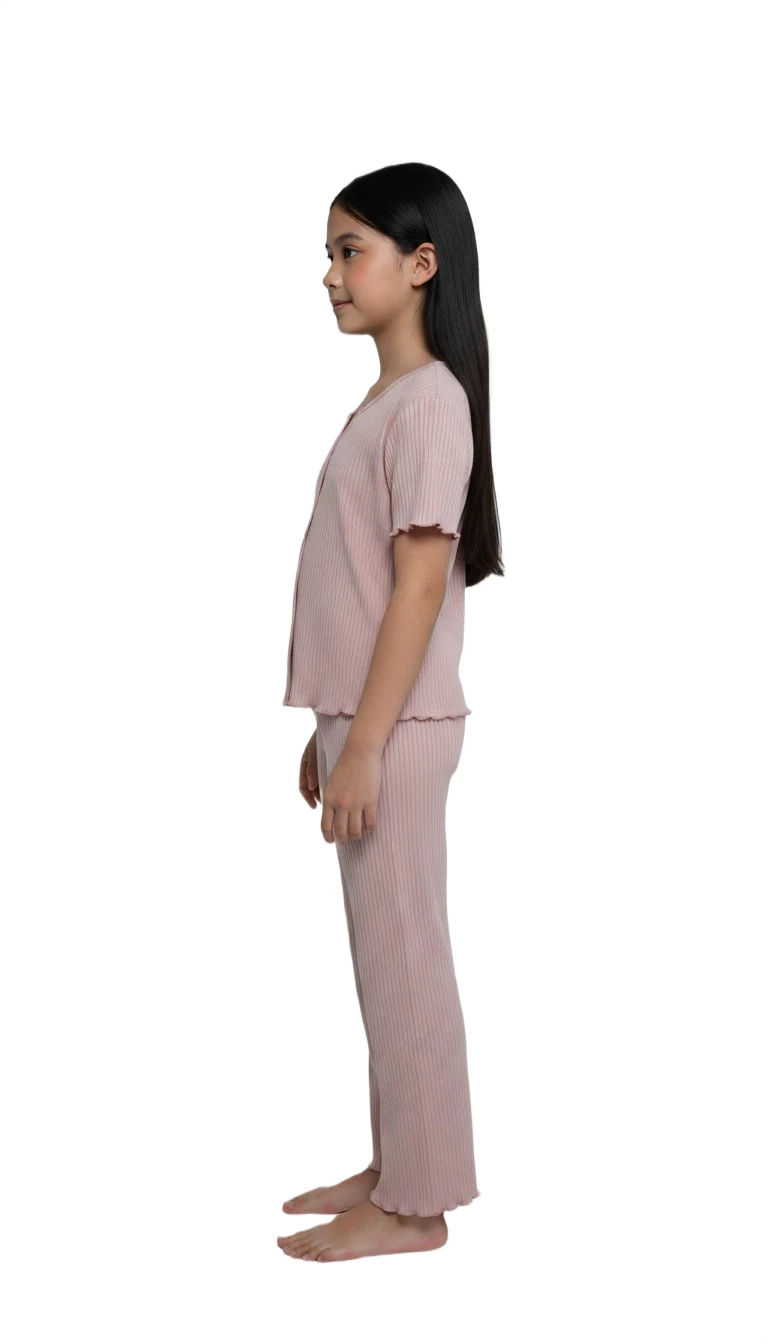 This adorable two-piece sleepwear ensemble is crafted from a wonderfully soft and stretchy ribbed knit fabric, ensuring she stays cozy and comfortable all night long or during relaxed daytime lounging. The short-sleeve top features a cute button-front design and delicate lettuce-edge trim, adding a touch of sweetness. The matching full-length pants come with a soft elastic waistband and a comfortable, relaxed fit, perfect for easy movement during sleep, play, or quiet time at home. This set combines effortless cuteness with supreme comfort, making it a bedtime favorite.