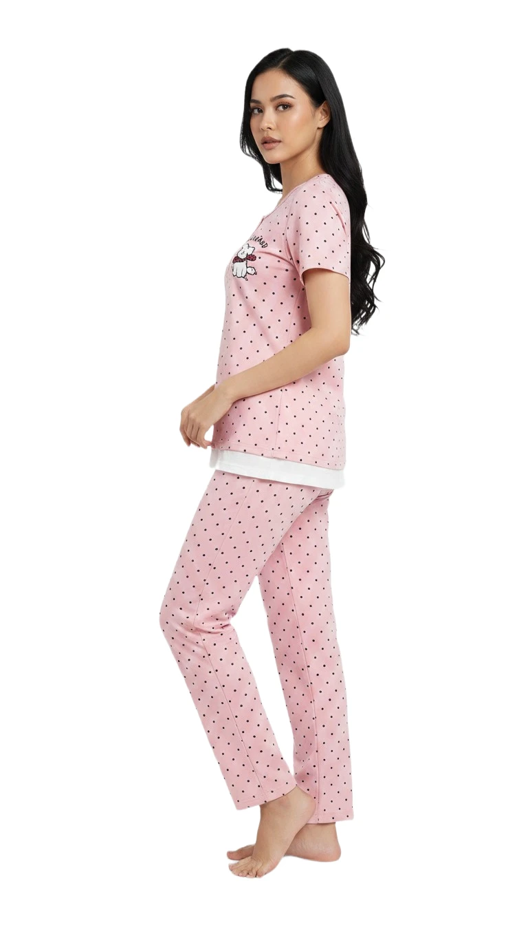 General: Ladies pajamas, women's pajama set, sleepwear, loungewear, nightwear, pink pajamas, polka dot pajamas, character pajamas, cute pajamas, comfortable pajamas, two-piece set, home wear.