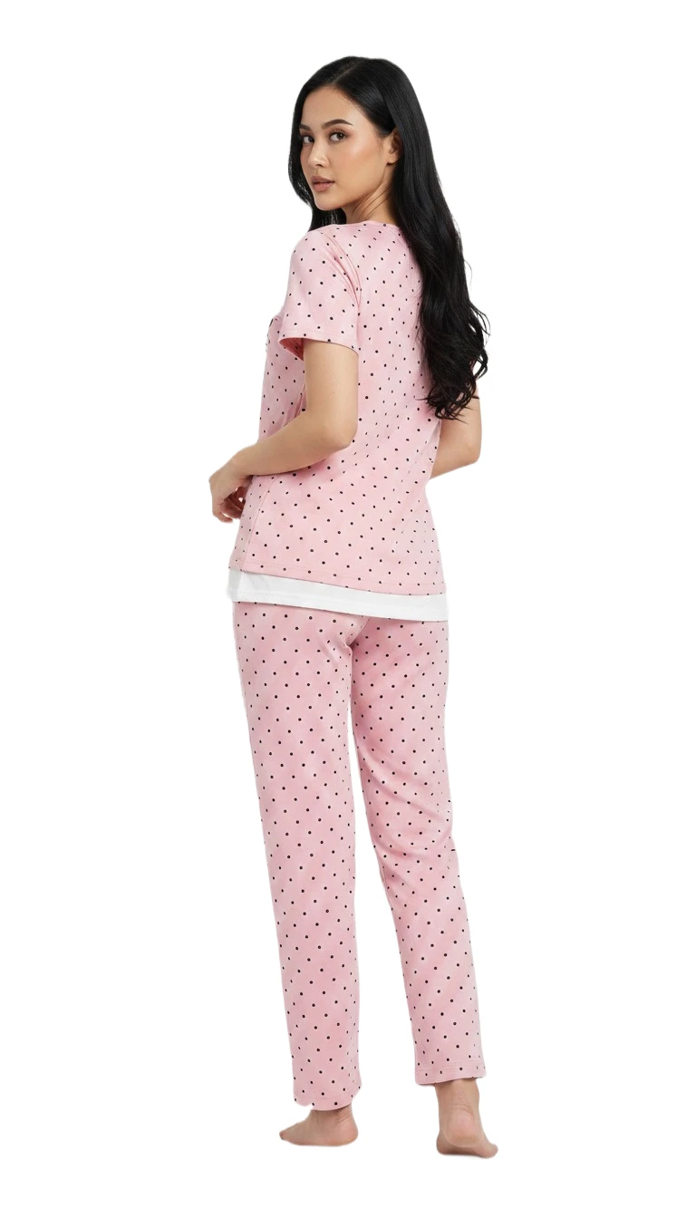 Indulge in delightful comfort with our Sweet Pink Polka Dot Ladies Pajama Set, perfect for adding a touch of whimsy to your nighttime routine. This charming two-piece sleepwear features a soft, breathable fabric in a lovely shade of pink, adorned with playful polka dots for a cheerful look. The short-sleeved top boasts a cute "MAROMOJ" graphic (appears to be "Marumofubiyori" or similar Sanrio character, a fluffy white bear/cat-like creature wrapped in a blanket) on the chest pocket, adding a fun, endearing touch. Designed for ultimate relaxation, the top has a relaxed fit and a subtle mock two-piece layered hem, while the matching full-length pants come with an elastic waistband for a comfortable, unrestricted feel. Whether you're settling in for a cozy evening, enjoying a lazy weekend morning, or drifting off to dreamland, this adorable pajama set promises comfort, cuteness, and smiles.