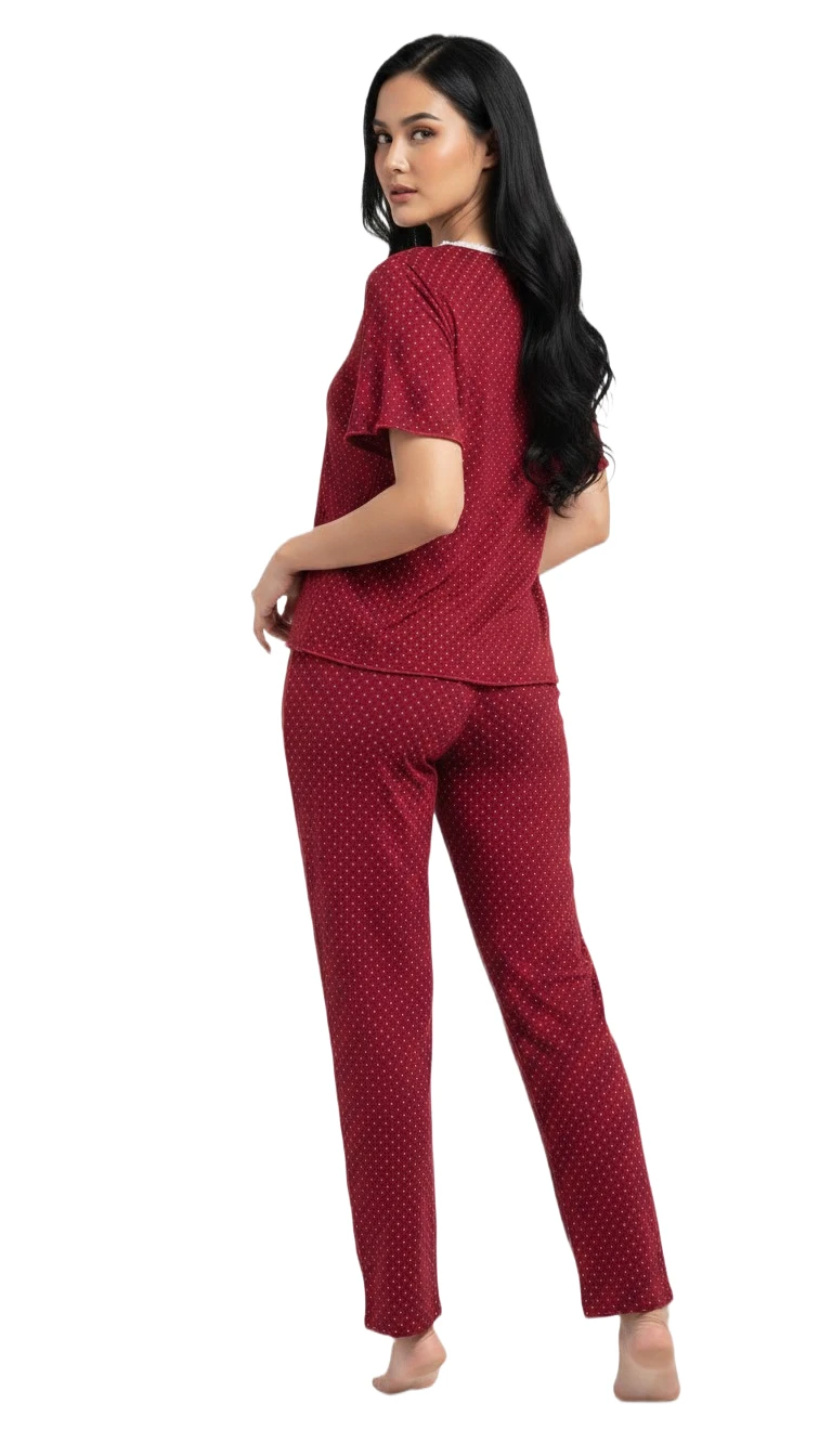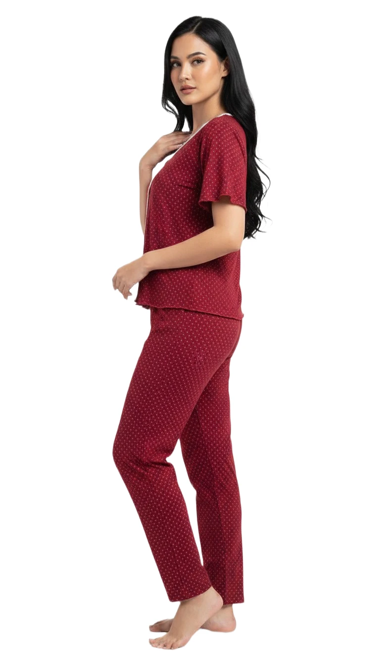 Unwind in luxurious comfort and captivating style with our Ruby Dotted Ladies Pajama Set. This elegant two-piece sleepwear ensemble is crafted from a sumptuously soft and breathable fabric in a rich, deep red (maroon/crimson) hue, subtly adorned with delicate micro-dots for a touch of refined charm. The short-sleeved top features a graceful round neckline with delicate lace or contrasting white trim, complemented by a functional button-front placket for ease of wear. The matching full-length pants offer a relaxed, comfortable fit with an elastic waistband, ensuring uninhibited relaxation whether you're drifting off to sleep or enjoying a leisurely morning. Perfect for adding a sophisticated yet cozy touch to your loungewear collection, this pajama set is an embodiment of comfort meets classic elegance.