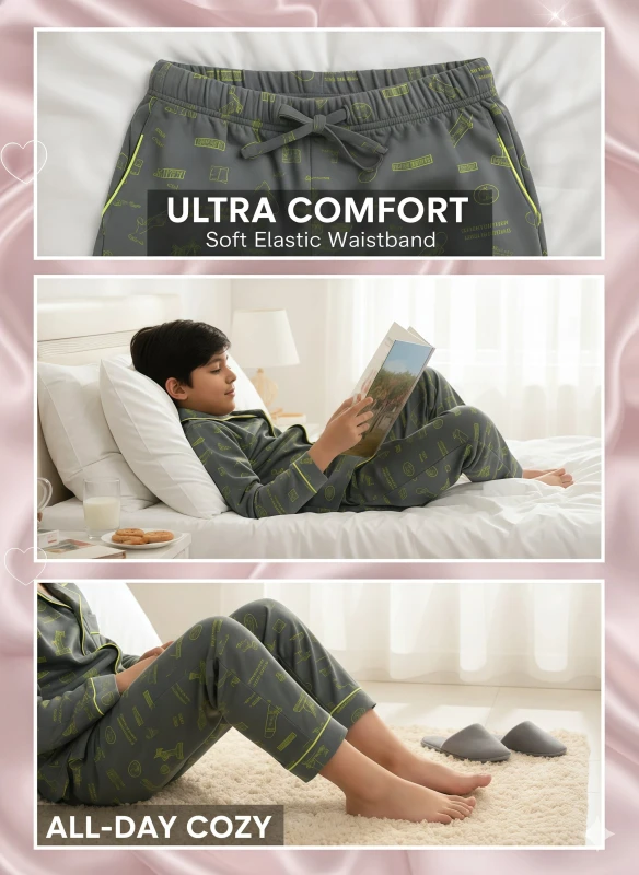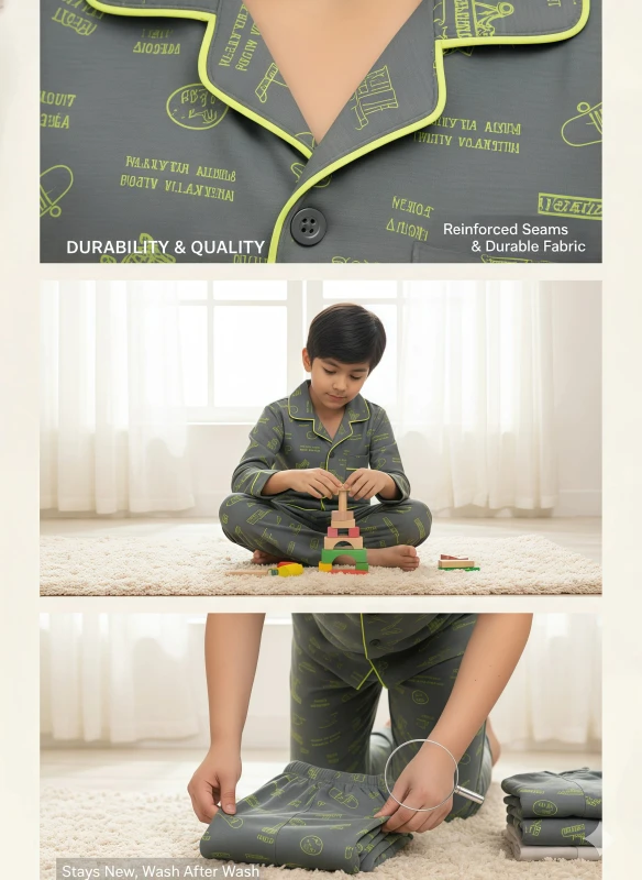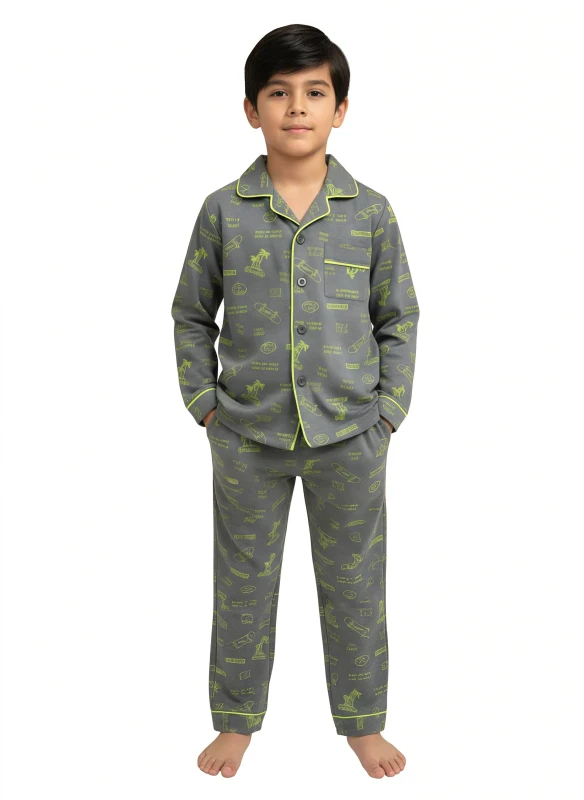General: Kids pajamas, children's sleepwear, boys pajamas, girls pajamas, sleep set, loungewear, nightwear, comfortable pajamas, soft pajamas, printed pajamas, full sleeve pajamas, long pants pajamas, button-down pajamas, kids clothing, casual wear, cozy pajamas.