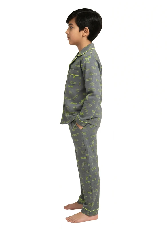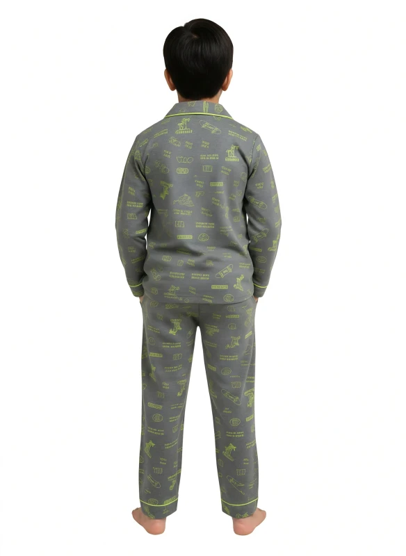 Let your little one drift off to dreamland in comfort and style with these fun and cozy Kids' Printed Pajamas! Made from a soft, breathable fabric, this two-piece sleep set features a classic collared long-sleeve shirt with a full button-down front and matching long pants. The charming all-over print, highlighted with vibrant lime green piping, adds a playful touch that your child will love. Perfect for a restful night's sleep or relaxed mornings at home, these pajamas combine comfort, durability, and a delightful design.