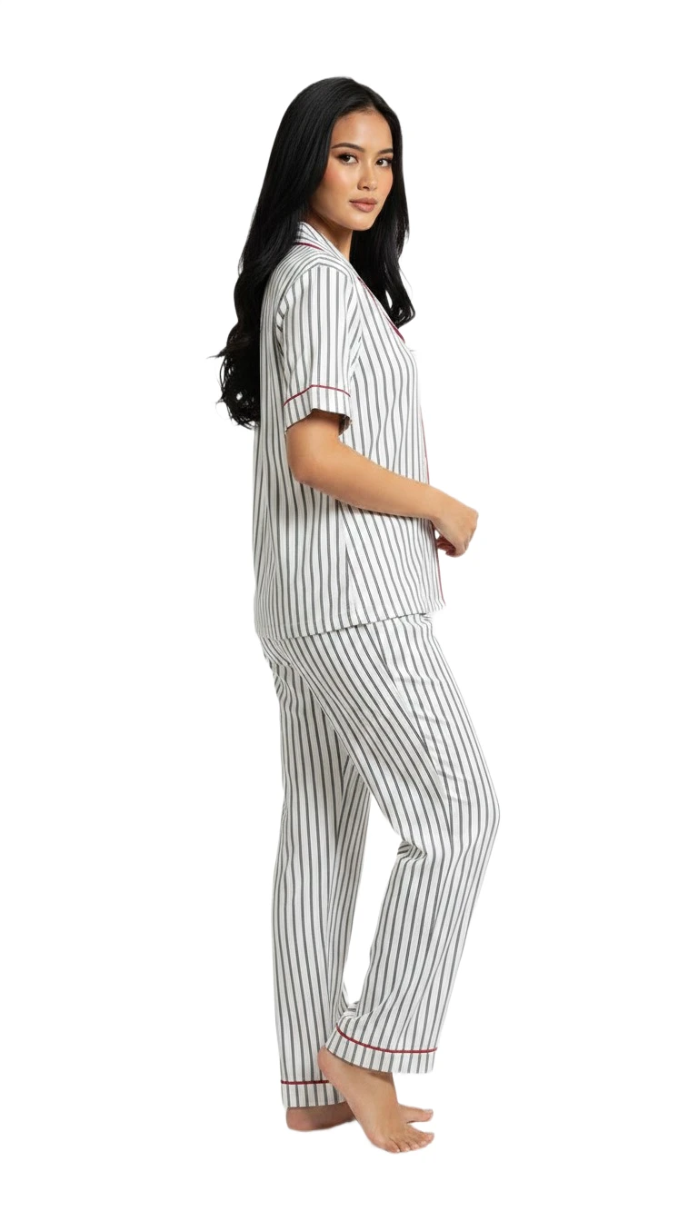 Drift into serene comfort with our Classic Striped Ladies Pajama Set, designed for effortless relaxation and sophisticated style. This two-piece sleepwear ensemble features a soft, breathable fabric adorned with elegant vertical stripes in a timeless monochrome palette, accented with subtle contrasting piping along the edges for a refined touch. The short-sleeved top boasts a traditional notched collar and a convenient button-front closure, while the matching full-length pants offer a relaxed fit with an elastic waistband for ultimate comfort throughout the night or during your leisurely mornings. Perfect for unwinding after a long day, lounging around the house, or enjoying a restful night's sleep, this pajama set combines classic design with modern comfort, making it an essential addition to any woman's sleepwear collection.
