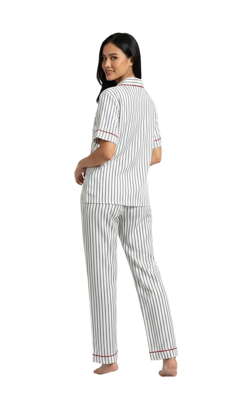 Style/Design: Striped pajamas, vertical stripe, classic stripes, elegant pajamas, chic sleepwear, sophisticated pajamas, button-down top, short sleeve pajamas, full-length pants, piped pajamas, notched collar.
