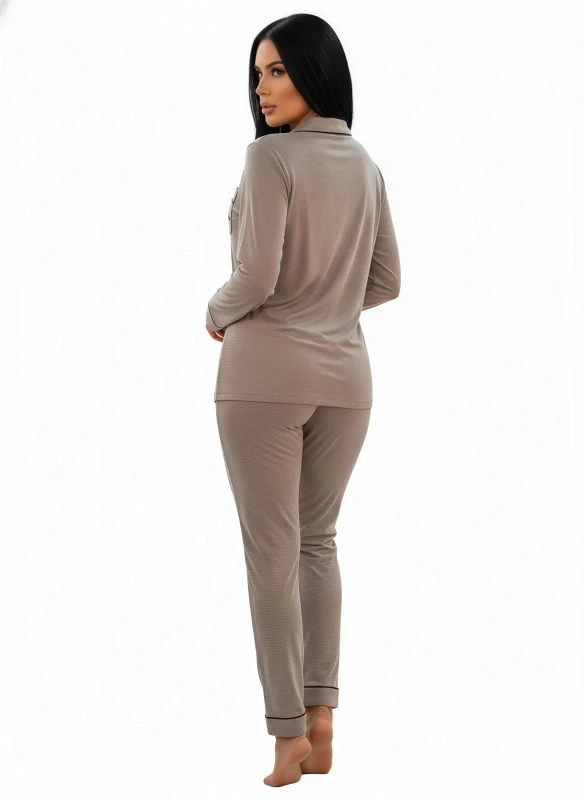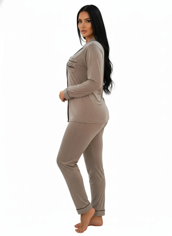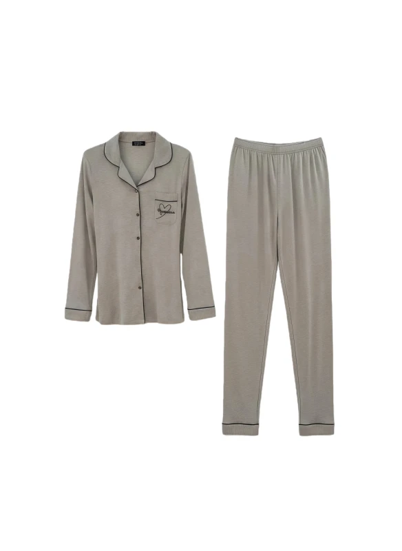 Relax in refined comfort with this cozy women's loungewear or pajama set. This two-piece ensemble features a long-sleeved button-up top and matching full-length pants, both crafted from a soft, marled fabric in a warm, neutral taupe or light grey hue. The top boasts a stylish v-neckline with a classic collar, accented by striking black piping that also adorns the cuffs and pant hems. A charming embroidered heart design with script on the chest pocket adds a personalized touch, making this set perfect for a comfortable night's sleep or a leisurely day at home.