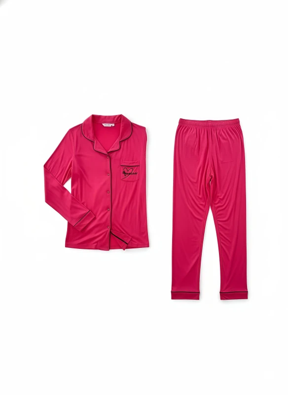 Relax in refined comfort with this cozy women's loungewear or pajama set. This two-piece ensemble features a long-sleeved button-up top and matching full-length pants, both crafted from a soft, marled fabric in a warm, neutral taupe or light grey hue. The top boasts a stylish v-neckline with a classic collar, accented by striking black piping that also adorns the cuffs and pant hems. A charming embroidered heart design with script on the chest pocket adds a personalized touch, making this set perfect for a comfortable night's sleep or a leisurely day at home.