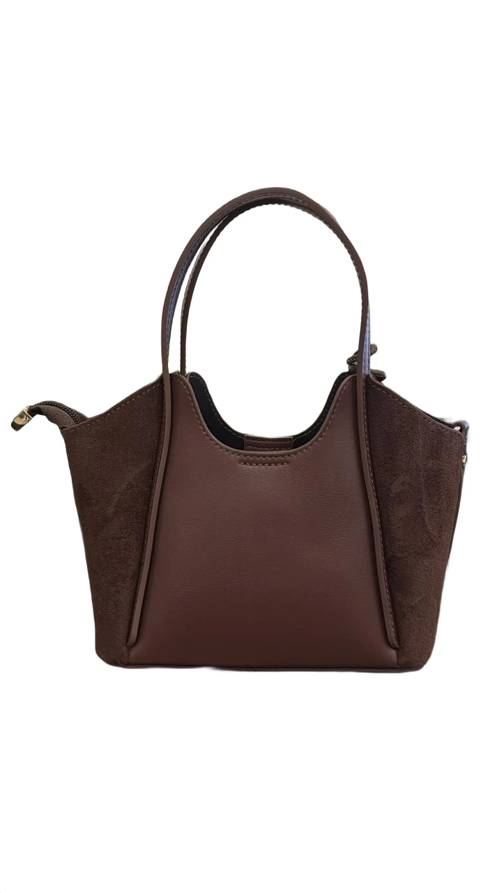 Inside, you'll find ample space for your belongings, while the included matching mini pouch keeps your smaller items organized and easily accessible. Whether carried by hand for a chic look or worn over the shoulder with the detachable, adjustable strap for hands-free convenience, this Chrisbella set seamlessly adapts to your busy lifestyle. From a casual brunch to an evening out, the "Suede Ember" set is designed to complement any ensemble with effortless elegance.