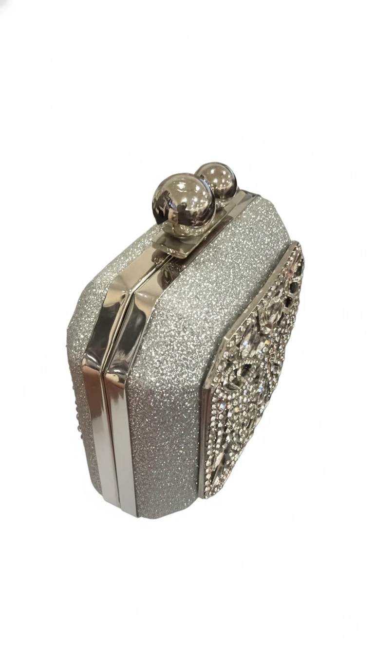 This magnificent minaudiere is a true work of art, featuring a unique octagonal silhouette enveloped in a subtle silver glitter finish that catches the light with understated elegance. The front is exquisitely adorned with an intricate, ornate pattern crafted from dazzling small crystals and larger, marquise-cut faceted jewels, creating a breathtaking filigree design. Two polished silver-tone orb clasps not only provide a secure closure but also add a touch of regal charm to this already luxurious piece. Perfectly sized for your essential evening valuables, this clutch is an absolute showstopper for galas, weddings, opera nights, or any grand occasion where you desire to infuse your ensemble with unparalleled sparkle and sophisticated allure."