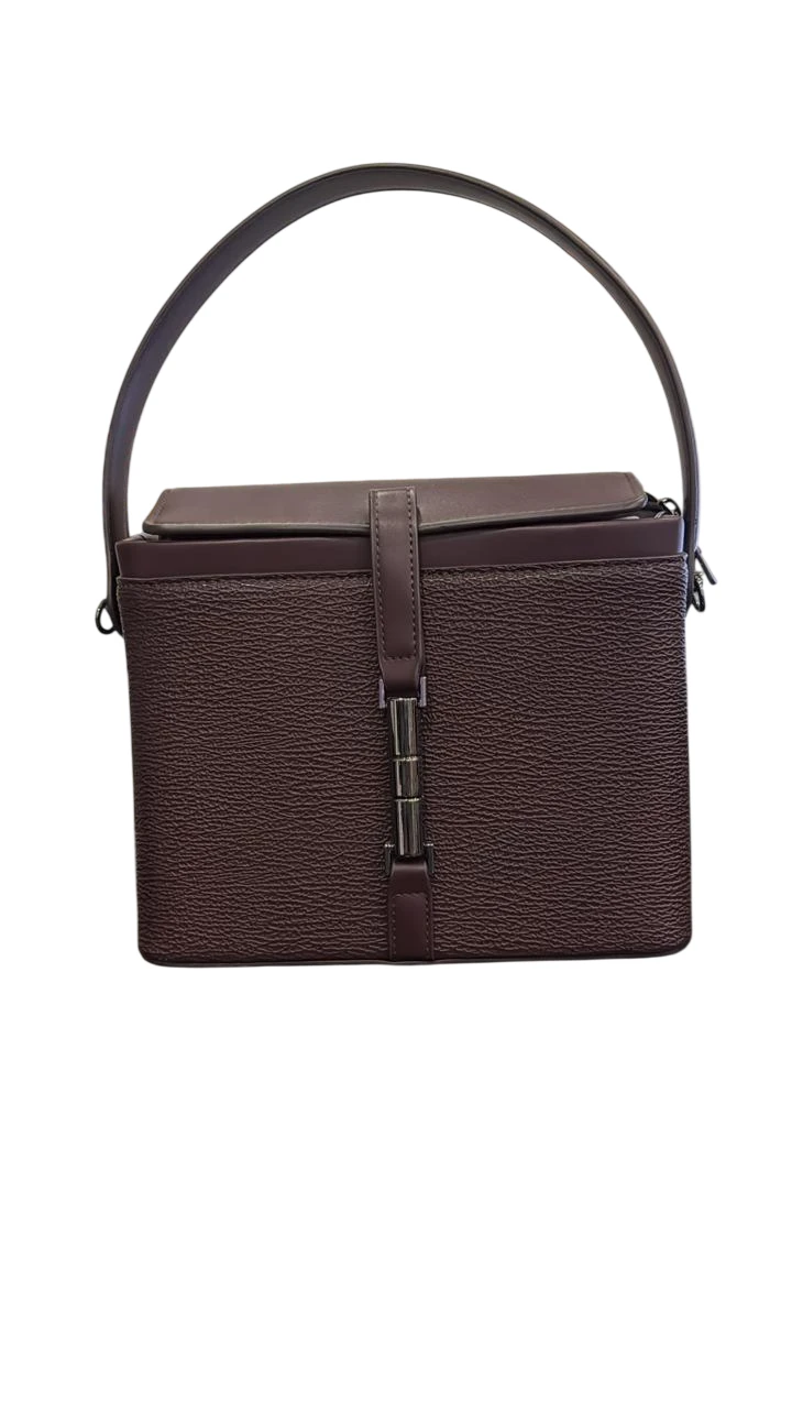 The satchel boasts a sleek, minimalist design with a comfortable top handle and a unique front strap closure featuring silver-toned hardware, adding a touch of refined detailing. Its structured form ensures your belongings stay organized, while the included detachable and adjustable shoulder strap offers versatile carrying options – from a chic top-handle to a convenient crossbody or shoulder bag.