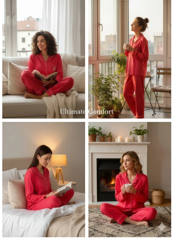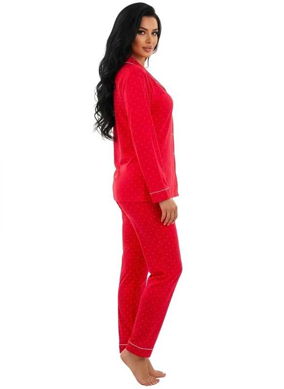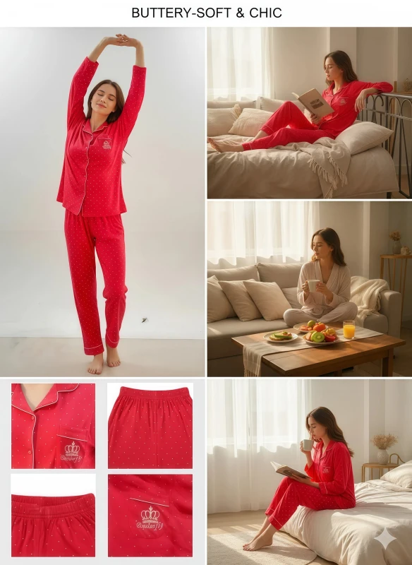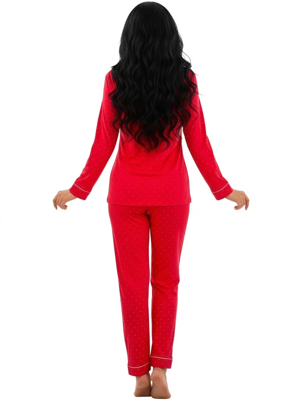 Rule your relaxation in regal style with this vibrant women's pajama set. This striking two-piece sleepwear ensemble features a long-sleeved button-up top and matching full-length pants, both in a bold red hue adorned with delicate white polka dots. The classic design is elevated by crisp white piping that outlines the collar, placket, and cuffs, creating a sharp contrast. A charming white embroidered crown design with "Queen" script on the chest pocket adds a touch of playful royalty, making this set perfect for comfortable nights and feeling fabulous while lounging.