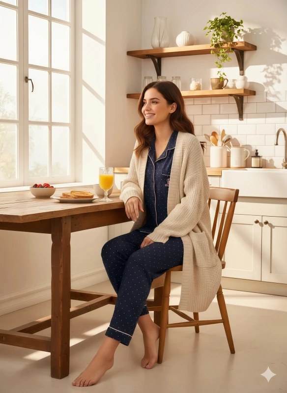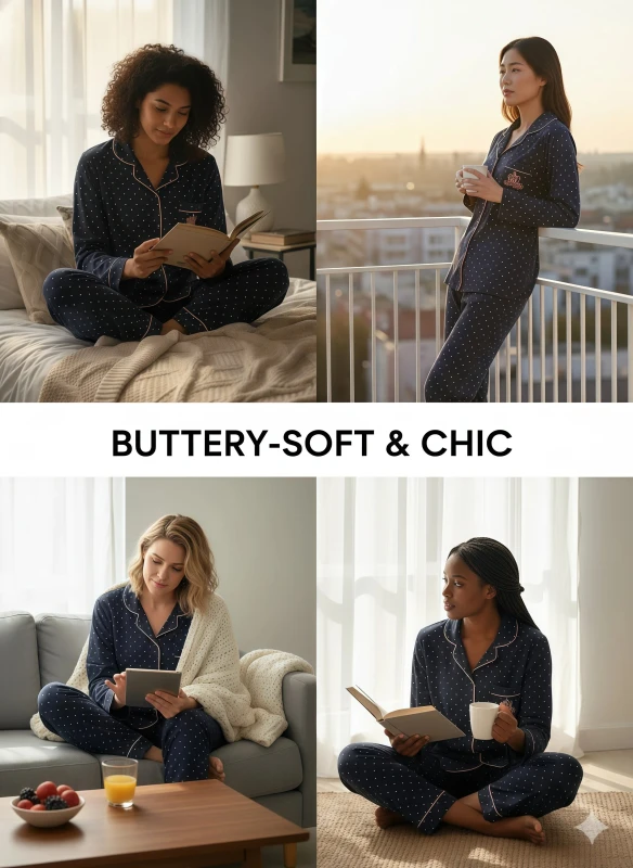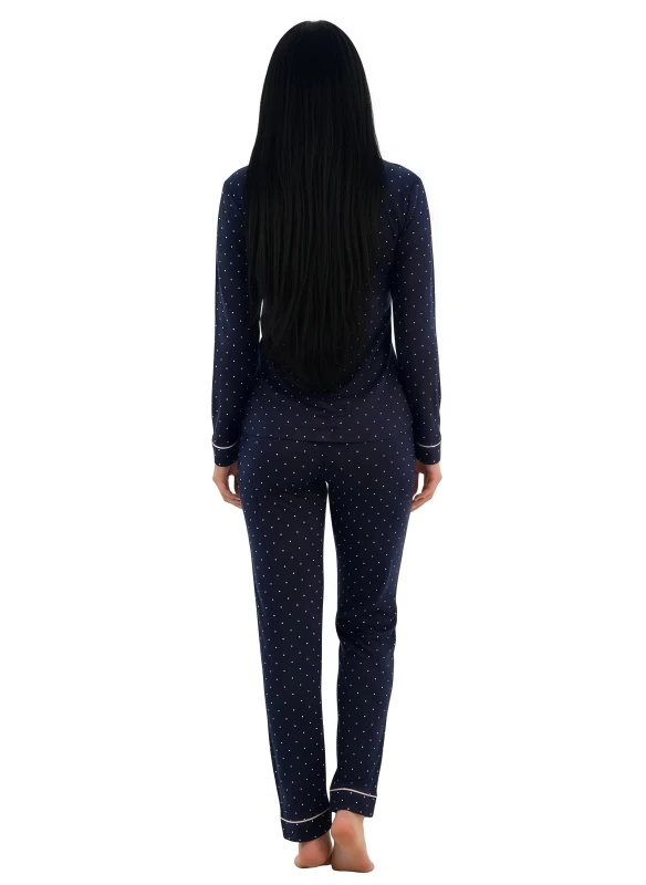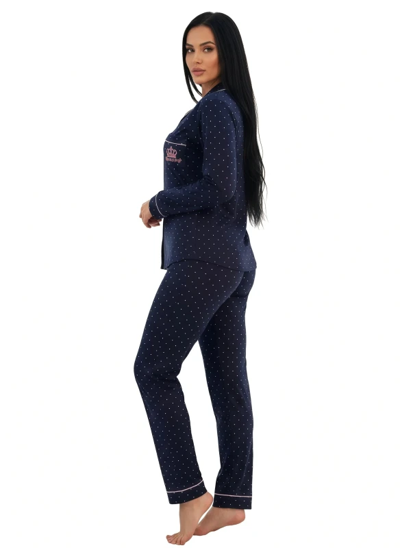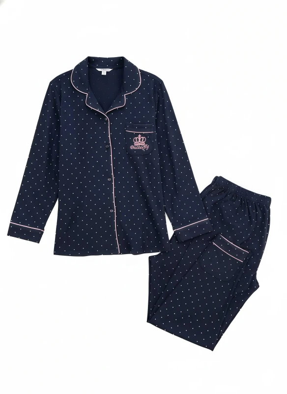 Rule your relaxation in regal style with this vibrant women's pajama set. This striking two-piece sleepwear ensemble features a long-sleeved button-up top and matching full-length pants, both in a bold red hue adorned with delicate white polka dots. The classic design is elevated by crisp white piping that outlines the collar, placket, and cuffs, creating a sharp contrast. A charming white embroidered crown design with "Queen" script on the chest pocket adds a touch of playful royalty, making this set perfect for comfortable nights and feeling fabulous while lounging.