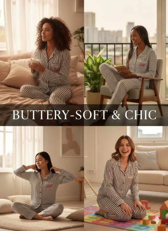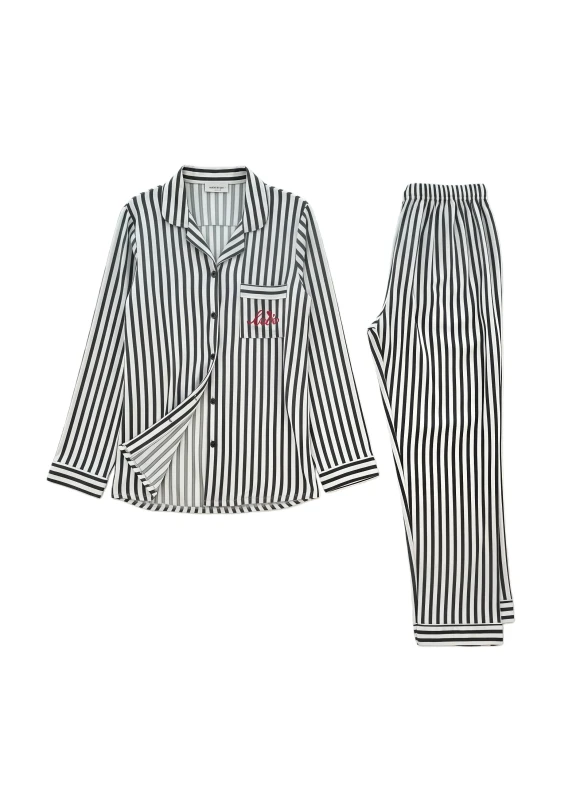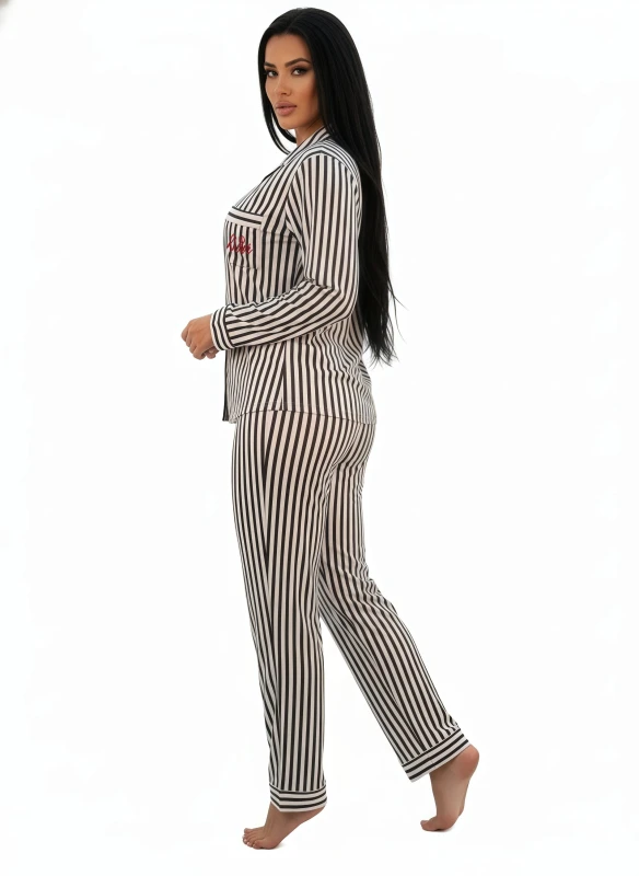 Step into sophisticated comfort with this chic women's pajama set, perfect for stylish lounging and restful nights. This elegant two-piece sleepwear ensemble features a long-sleeved button-up top and matching full-length pants, both adorned with a classic black and white vertical stripe pattern. The crisp lines create a timeless aesthetic, while the subtle red embroidery on the chest pocket adds a touch of playful charm. Crafted from soft, breathable fabric, this set promises both comfort and effortless style for your relaxation moments.