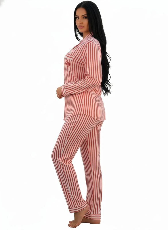 Step into sophisticated comfort with this chic women's pajama set, perfect for stylish lounging and restful nights. This elegant two-piece sleepwear ensemble features a long-sleeved button-up top and matching full-length pants, both adorned with a classic black and white vertical stripe pattern. The crisp lines create a timeless aesthetic, while the subtle red embroidery on the chest pocket adds a touch of playful charm. Crafted from soft, breathable fabric, this set promises both comfort and effortless style for your relaxation moments.