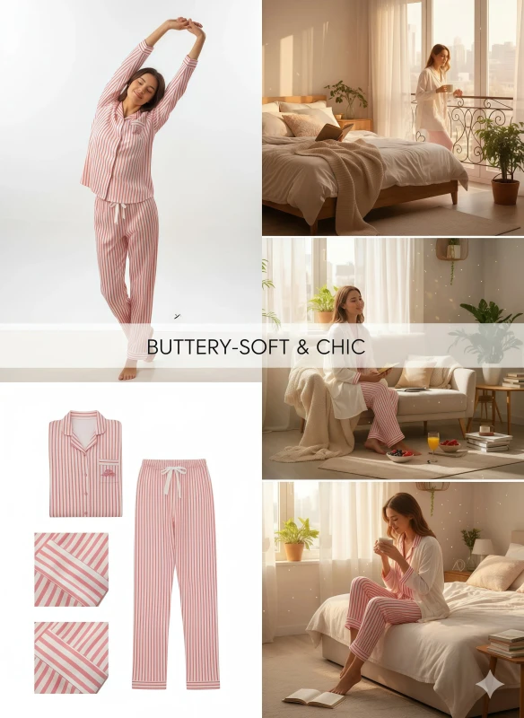 Two-Piece Pajama Set: Includes a long-sleeved button-up top and coordinating full-length pants.