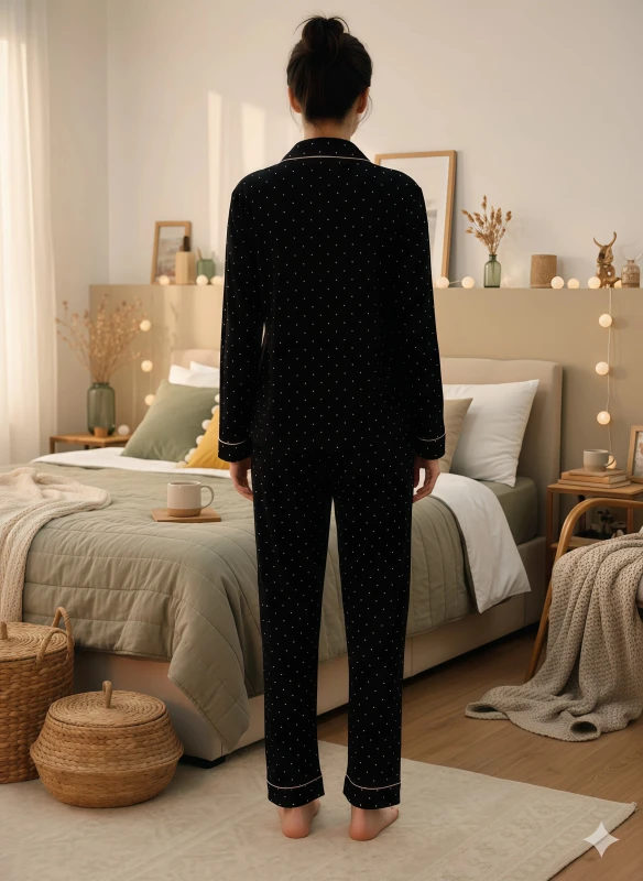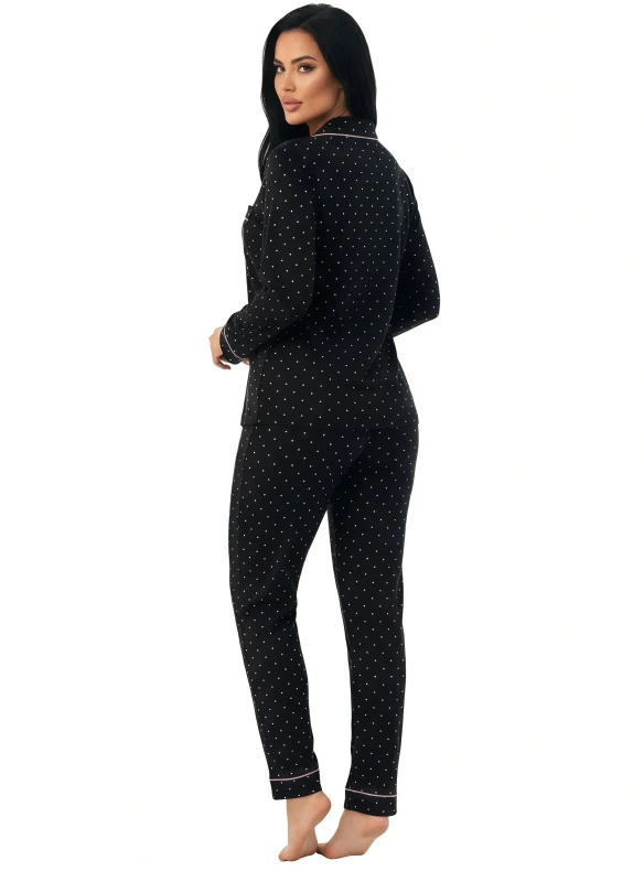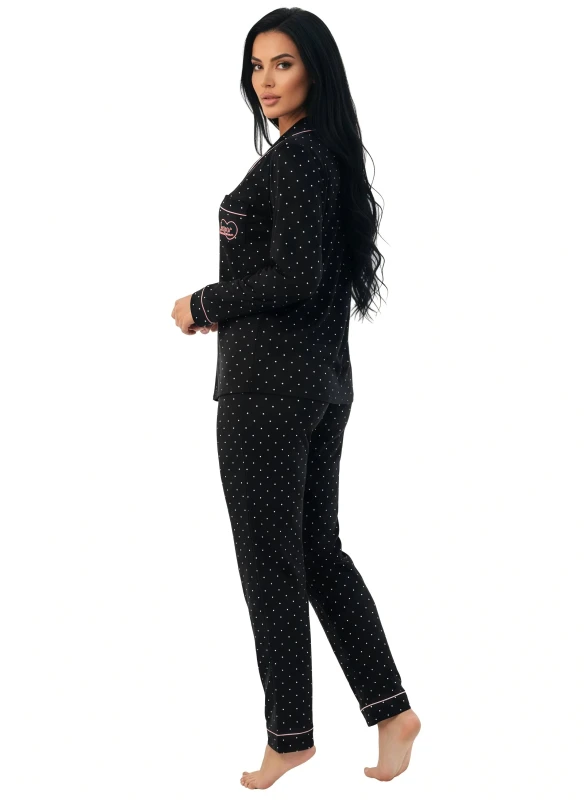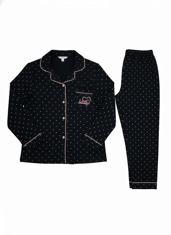 Drift off to dreamland in style with this adorable women's pajama set. This cozy two-piece sleepwear ensemble features a long-sleeved button-up top and matching full-length pants, both adorned with a charming tiny polka dot pattern on a vibrant blue background. The playful design is accented by bold pink piping that outlines the collar, placket, and cuffs, creating a striking contrast. A delightful embroidered heart with "Love" script on the chest pocket adds a sweet and personalized touch, making this set perfect for comfortable nights and relaxed mornings.
