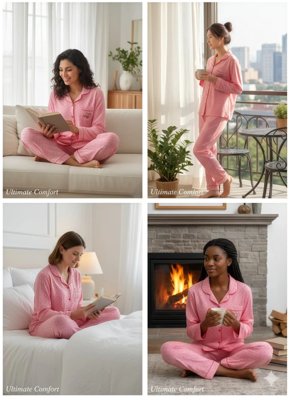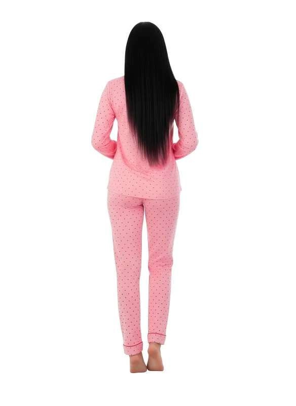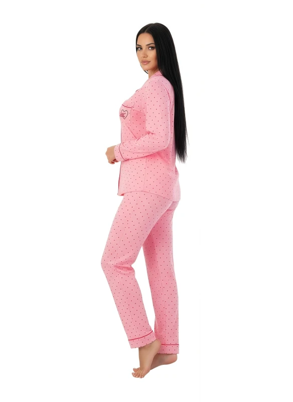 Drift off to dreamland in style with this adorable women's pajama set. This cozy two-piece sleepwear ensemble features a long-sleeved button-up top and matching full-length pants, both adorned with a charming tiny polka dot pattern on a vibrant blue background. The playful design is accented by bold pink piping that outlines the collar, placket, and cuffs, creating a striking contrast. A delightful embroidered heart with "Love" script on the chest pocket adds a sweet and personalized touch, making this set perfect for comfortable nights and relaxed mornings.