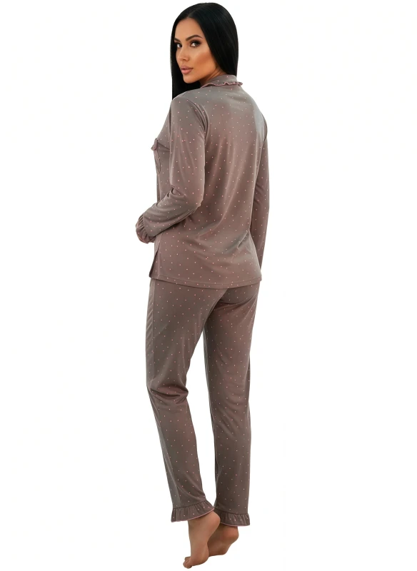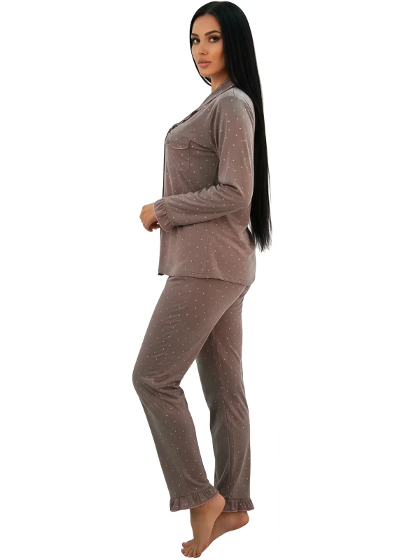 Embrace playful charm and cozy comfort with this delightful women's pajama set. This two-piece sleepwear ensemble features a long-sleeved button-up top and matching full-length pants, both adorned with a fun polka dot pattern on a soft coral or peach-pink background. The top boasts a unique ruffled collar and ruffled cuffs, adding a whimsical touch, while the pants feature matching ruffled hems for a cohesive and adorable look. Crafted from a soft, breathable fabric, this set ensures sweet dreams and stylish lounging.