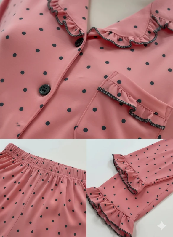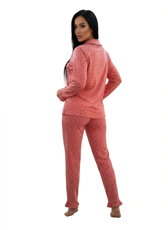 Embrace playful charm and cozy comfort with this delightful women's pajama set. This two-piece sleepwear ensemble features a long-sleeved button-up top and matching full-length pants, both adorned with a fun polka dot pattern on a soft coral or peach-pink background. The top boasts a unique ruffled collar and ruffled cuffs, adding a whimsical touch, while the pants feature matching ruffled hems for a cohesive and adorable look. Crafted from a soft, breathable fabric, this set ensures sweet dreams and stylish lounging.