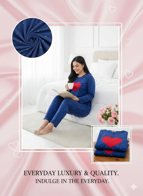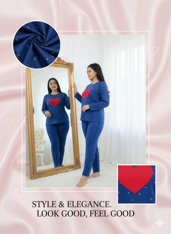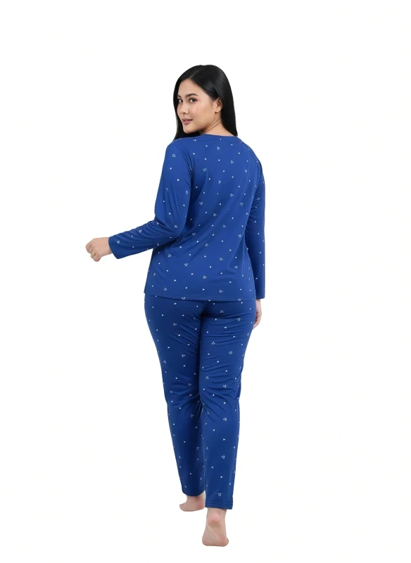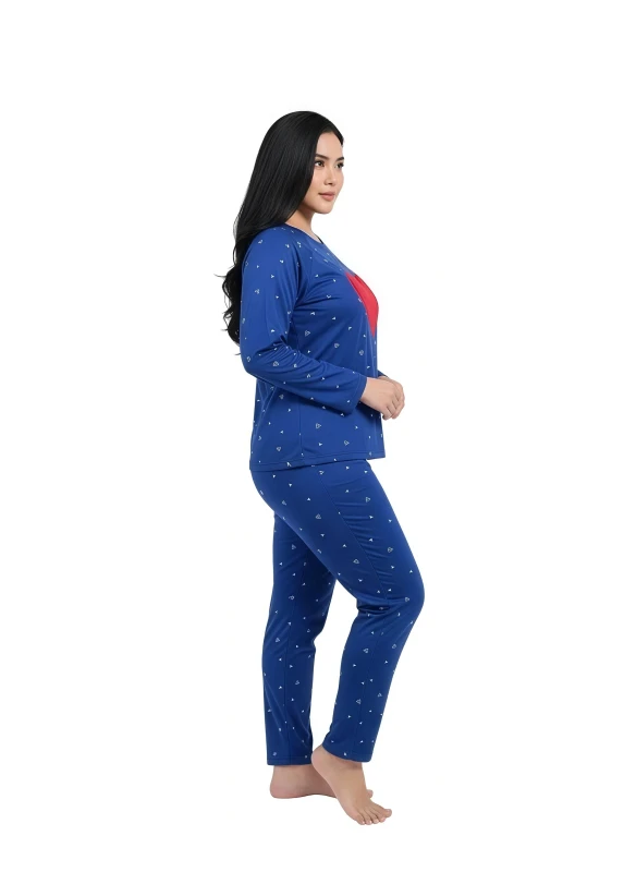 This charming pajama set is designed for ultimate comfort and style, perfect for lounging at home or a cozy night's sleep. The set features a vibrant royal blue long-sleeved top adorned with a prominent red heart applique on the chest, making a sweet and playful statement. Scattered across the blue fabric of both the top and the matching pants are subtle, smaller heart or star patterns, adding a touch of whimsy and detail to the overall design.