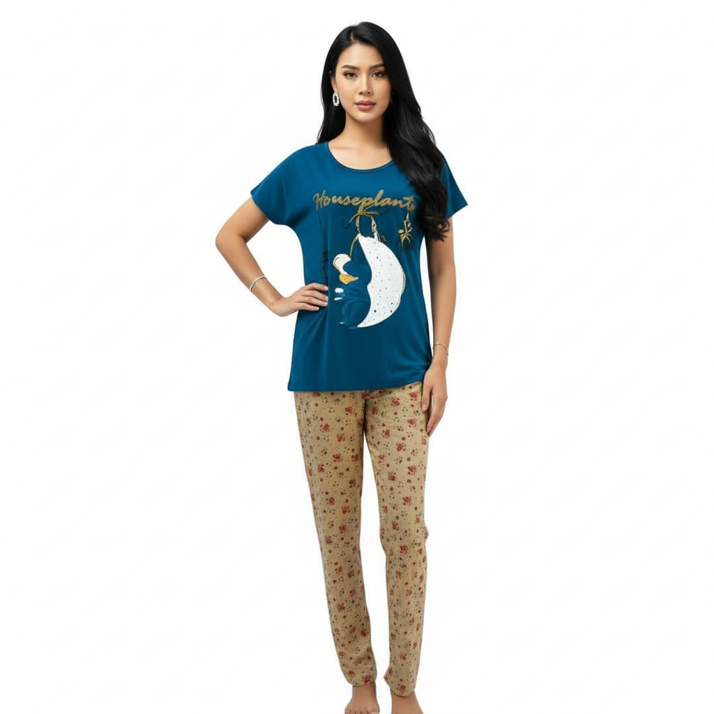 The top features a playful graphic of a koala cuddling a cup of tea under a hanging planter, with the charming “Houseplant” text printed above – a design that’s sure to bring a smile. The bottoms are adorned with delicate all-over floral prints, complementing the top beautifully for a coordinated and relaxing look.