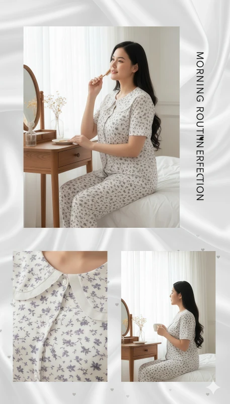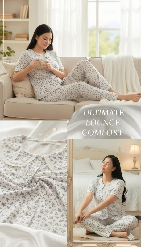 This delightful two-piece set features a soft, breathable fabric adorned with a subtle and elegant floral pattern in shades of grey and white. The short-sleeved top boasts a classic round collar with delicate lace trim, adding a touch of feminine charm, and a button-front closure for easy wear. The matching full-length pajama pants offer a comfortable fit, ensuring unrestricted movement whether you're lounging or sleeping. Perfect for year-round comfort, this pajama set combines timeless style with ultimate relaxation.