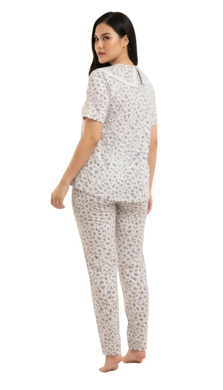 Style/Design: Floral print, grey floral, white pajamas, patterned pajamas, short sleeve pajamas, long pants pajamas, button-front top, lace collar.