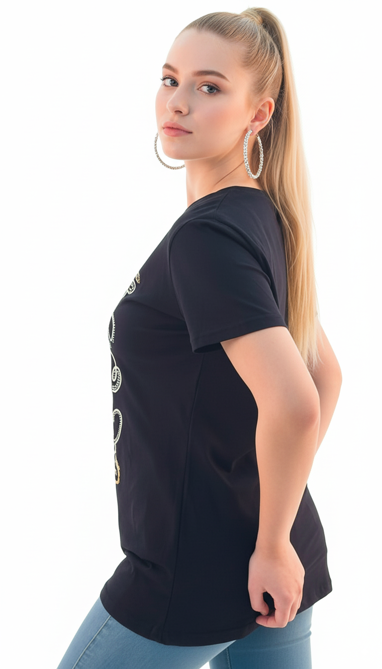 Women's Geometric Design Round Neck Short Sleeve T-Shirt - Black