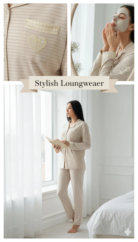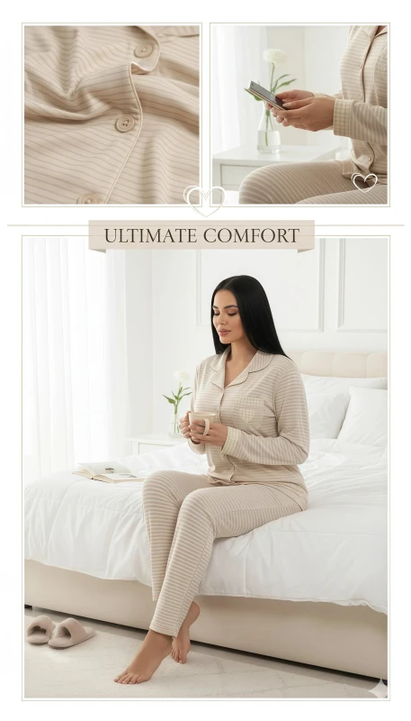 This pajama set is more than just sleepwear; it's an invitation to embrace relaxation and feel effortlessly chic, even in the comfort of your own home. It's an ideal choice for anyone seeking a blend of classic style, superior comfort, and a touch of playful elegance in their everyday loungewear.