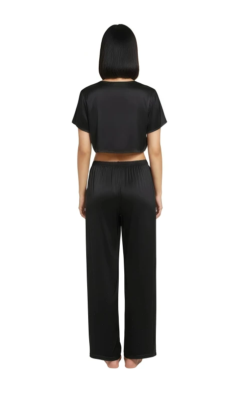 This item is a pair of black, loose-fitting, wide-leg pants. They appear to be made from a soft, lightweight fabric that drapes smoothly, possibly a jersey knit, modal, or similar comfortable material. The waistband is elasticated, visible by the slight gathering at the top edge, suggesting ease of wear. The length appears to be full-length, falling to or near the ankles.