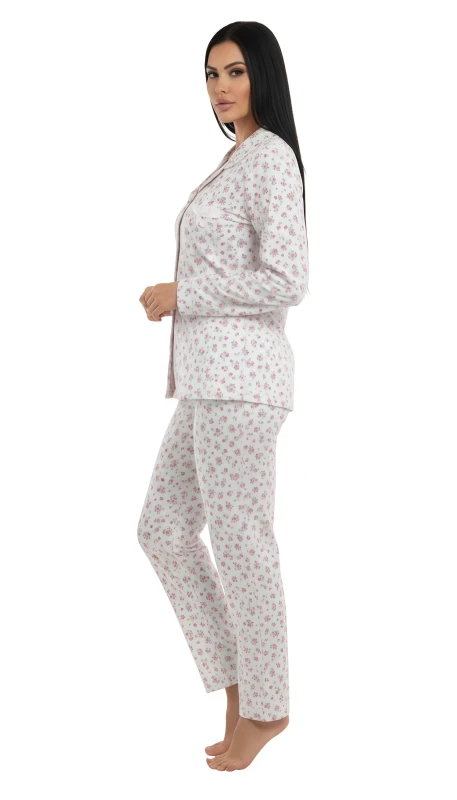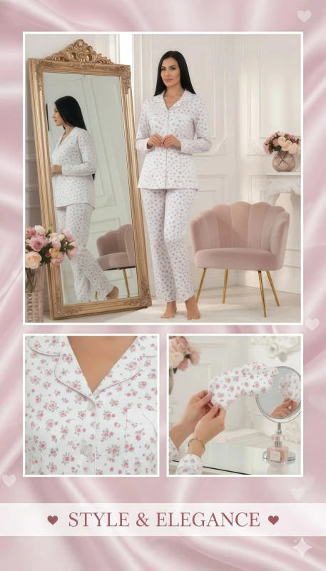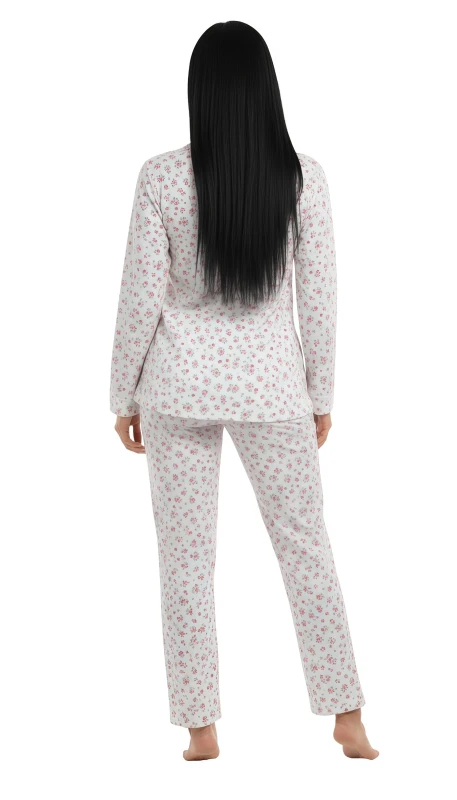 This charming women's pajama set offers a blend of comfort and delicate style, ideal for a relaxing evening at home. The pristine white fabric is adorned with an all-over dainty print of small pink and red floral bursts, creating a sweet and subtle pattern.