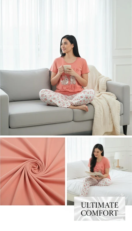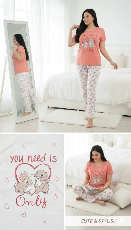 This two-piece sleepwear set features a vibrant red short-sleeved top adorned with an adorable graphic of two cuddly bunnies nestled within a heart, accompanied by the tender message "All you need is Only" (presumably "Love" as the last word, though not fully visible). The round-neck top offers a relaxed and comfortable fit. Complementing the top are the lovely full-length pajama bottoms, showcasing a delicate all-over floral print with small pink and red blossoms and green leaves on a pristine white background. Crafted from soft, breathable fabric, this pajama set combines heartfelt cuteness with timeless floral elegance, making it perfect for unwinding in style and comfort.