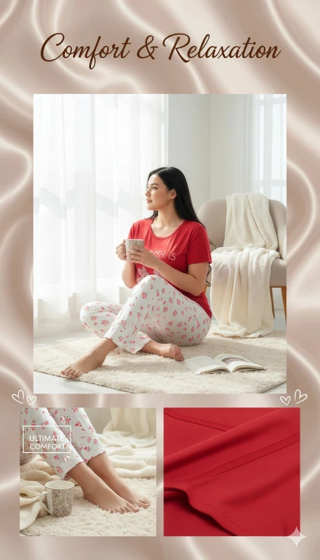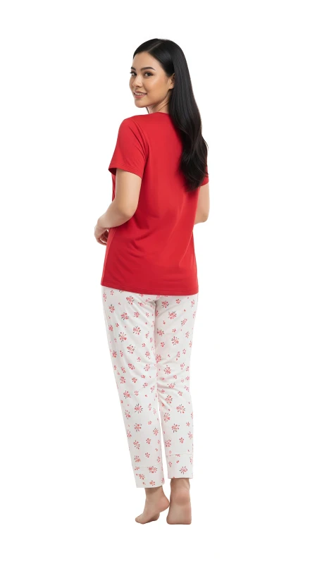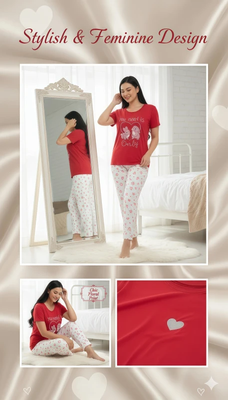 This two-piece sleepwear set features a vibrant red short-sleeved top adorned with an adorable graphic of two cuddly bunnies nestled within a heart, accompanied by the tender message "All you need is Only" (presumably "Love" as the last word, though not fully visible). The round-neck top offers a relaxed and comfortable fit. Complementing the top are the lovely full-length pajama bottoms, showcasing a delicate all-over floral print with small pink and red blossoms and green leaves on a pristine white background. Crafted from soft, breathable fabric, this pajama set combines heartfelt cuteness with timeless floral elegance, making it perfect for unwinding in style and comfort.