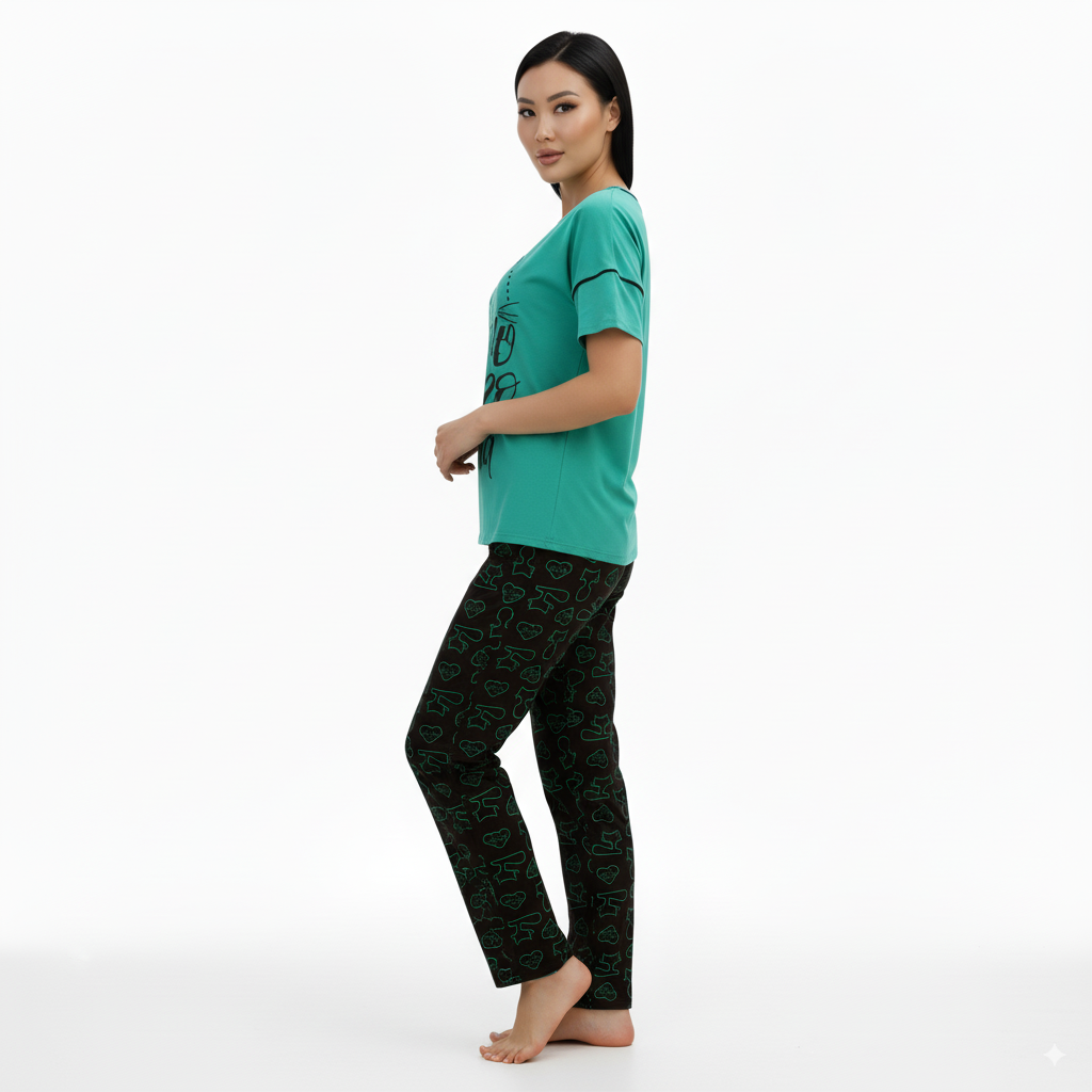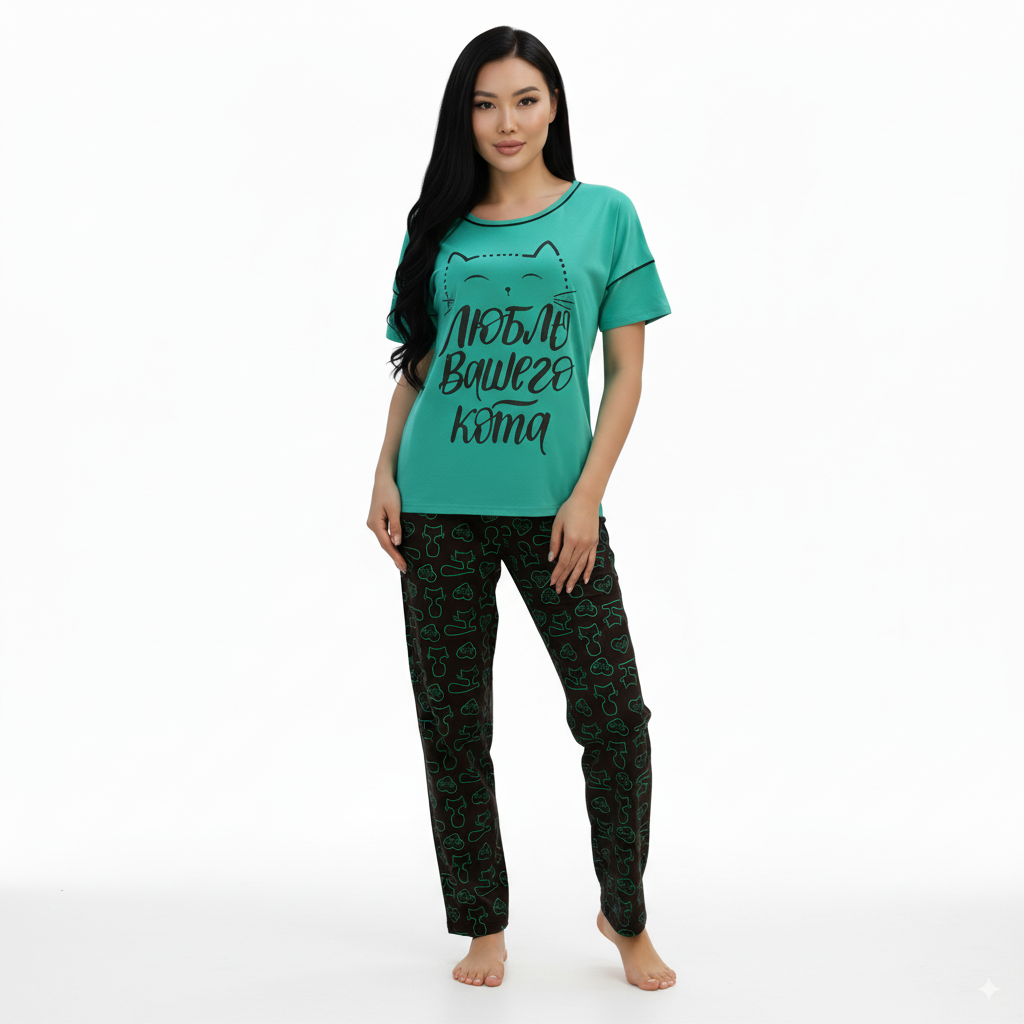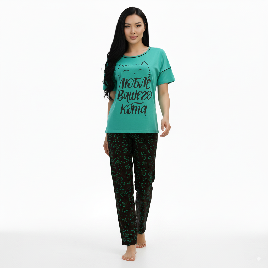 Women's "Love Your Cat" Cotton Pajama Set - LightSeaGreen