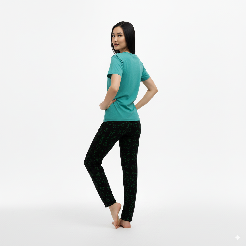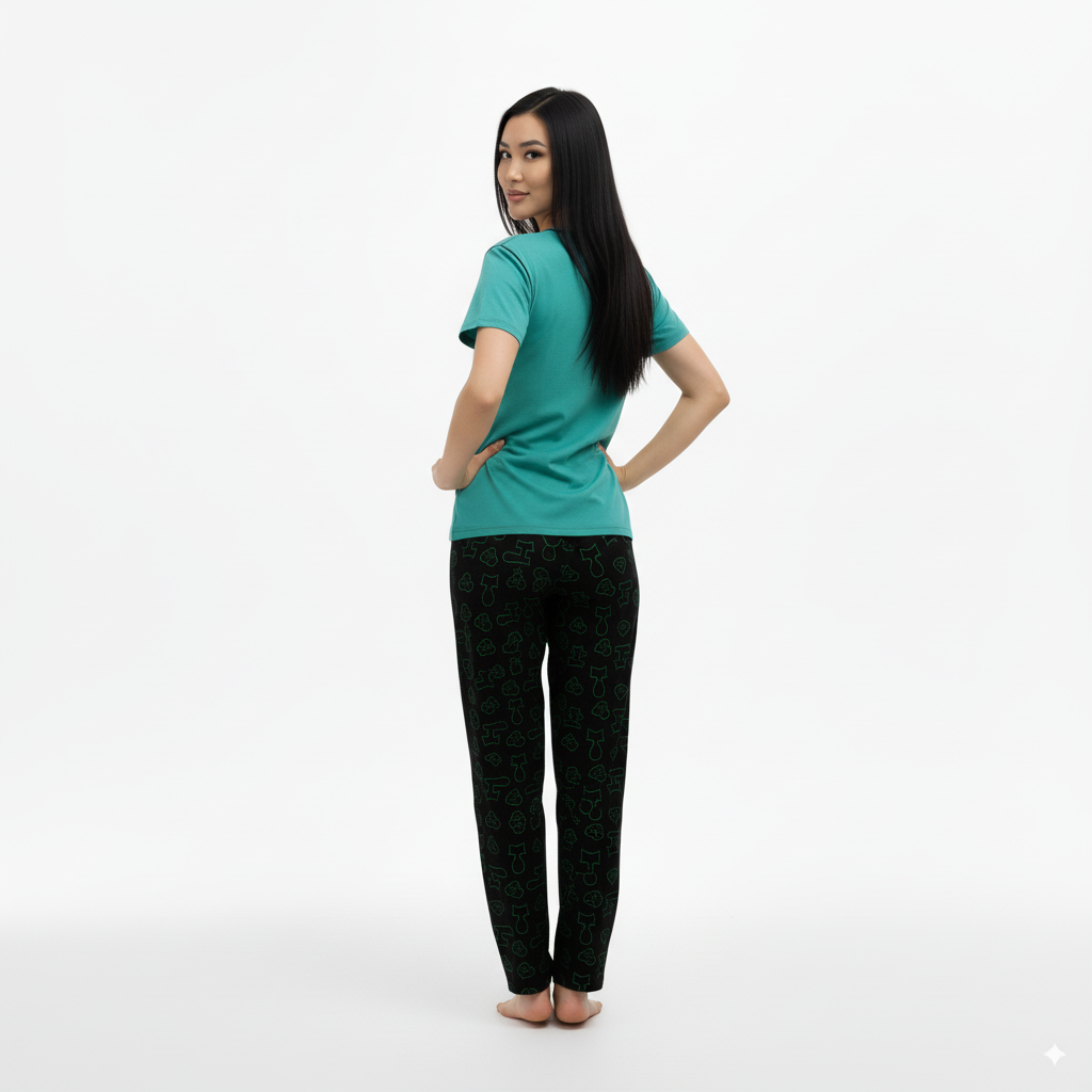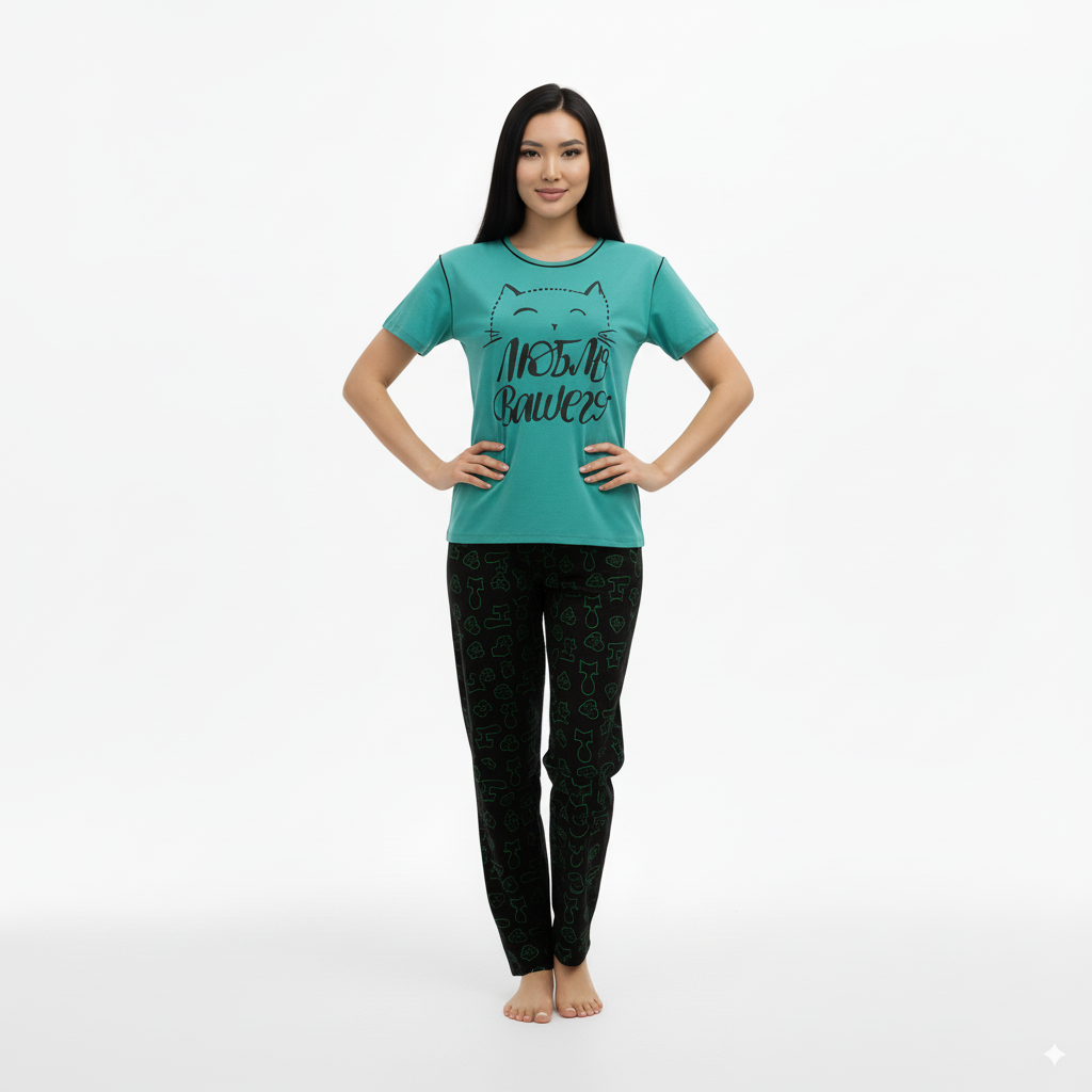Women's "Love Your Cat" Cotton Pajama Set - LightSeaGreen