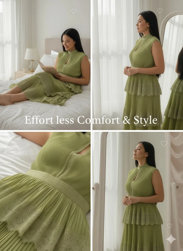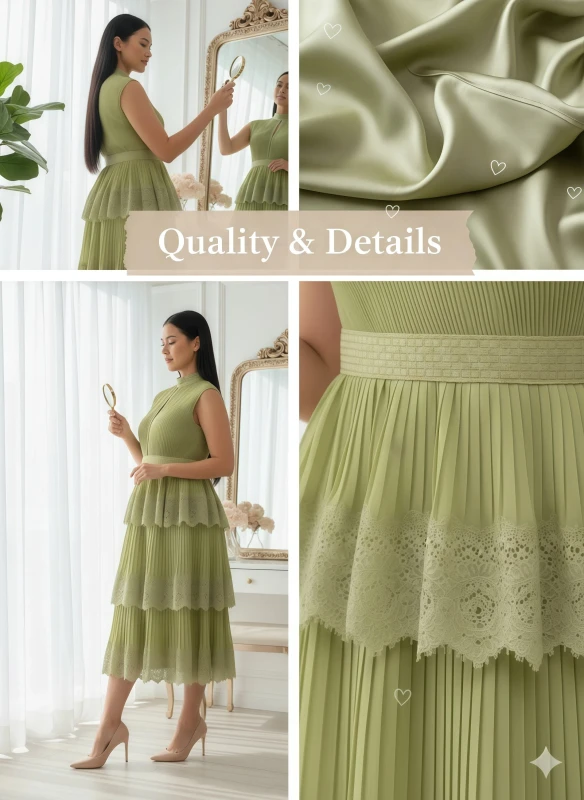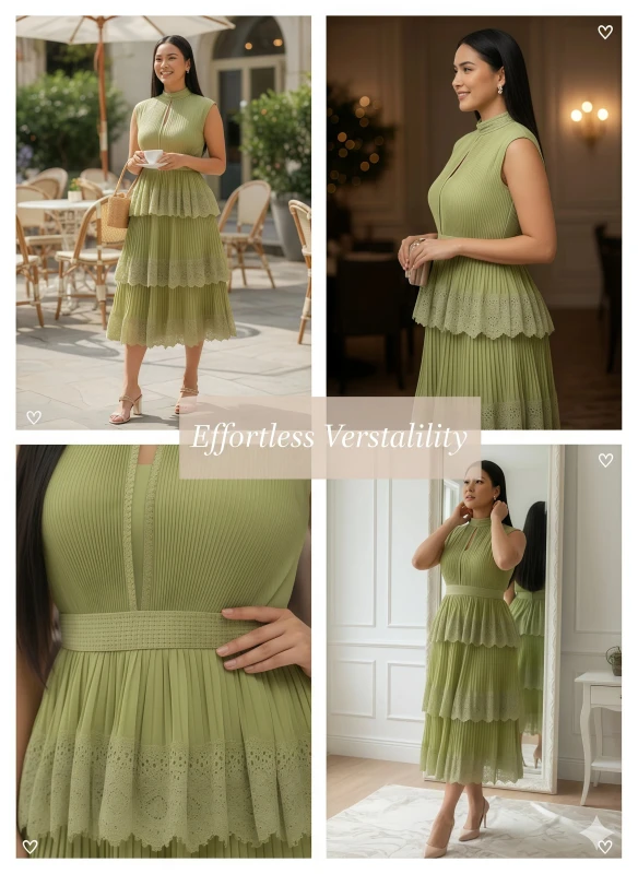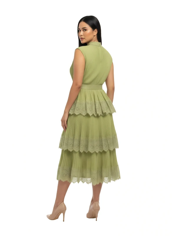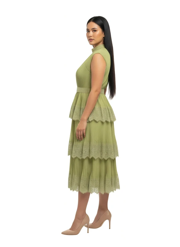 Embrace sophisticated charm with this stunning tiered midi dress, perfect for garden parties, brunches, or special occasions. This sleeveless dress features a chic mock neckline with an alluring keyhole cutout, adding a modern touch. The fitted bodice flows gracefully into a multi-tiered skirt, combining delicate eyelet lace details with elegant pleats for beautiful movement and texture. A subtle waistband cinches the figure, creating a universally flattering silhouette. Crafted in a lovely blush hue, this dress ensures you'll look effortlessly stylish and refined.