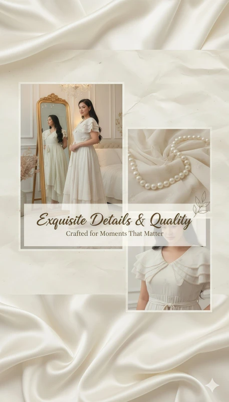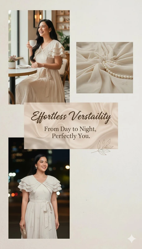 The standout tiered ruffle collar, embellished with lustrous pearls, beautifully frames the neckline, adding a touch of sophisticated whimsy. Complemented by charming ruffled cap sleeves, this dress creates a soft, feminine silhouette. A matching tie-waist sash cinches gracefully, accentuating your figure while offering an adjustable and comfortable fit.