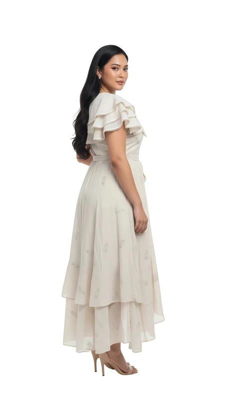 Crafted with a flowing, lightweight fabric, the dress boasts a high-low tiered hemline that sways with every step, creating an enchanting movement. Whether you're attending a garden party, a sophisticated brunch, or a special daytime event, the Ethereal Bloom Ruffle Midi Dress promises to make you feel radiant and gracefully confident. Pair it with your favorite heels for a complete, unforgettable look.