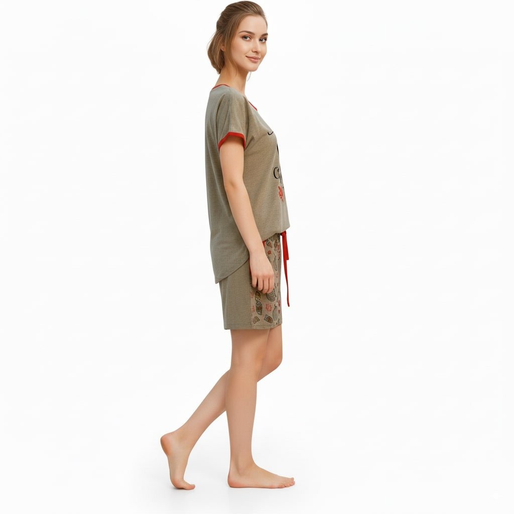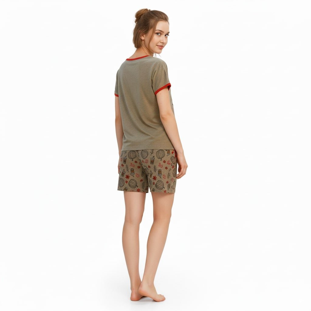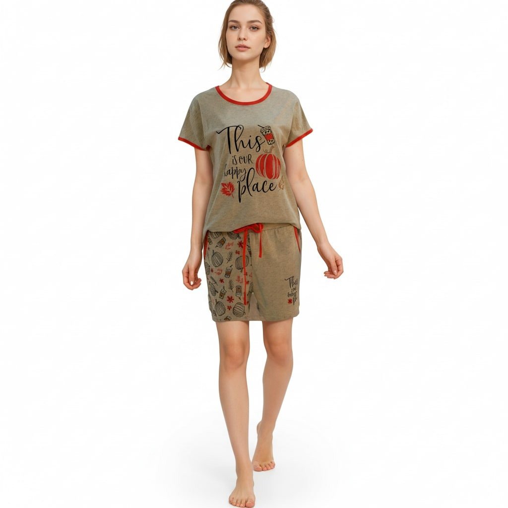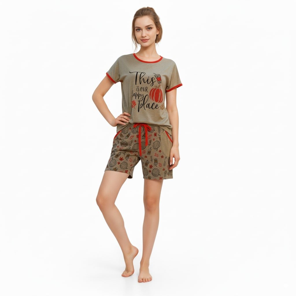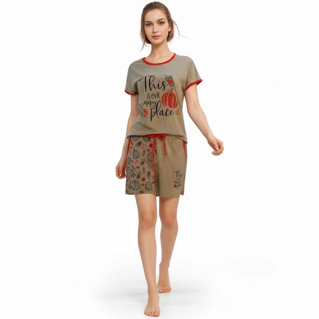 Crafted from soft, breathable cotton, this adorable set features a relaxed-fit top with playful prints and inspiring typography – “This is our happy place”. The set includes coordinating shorts with charming seasonal illustrations like pumpkins, leaves, and coffee cups, adding a touch of whimsy to your downtime. A contrasting neckline and sleeve trim, paired with an adjustable drawstring waistband, ensure a flattering fit with a cute pop of color.