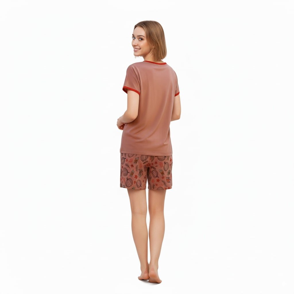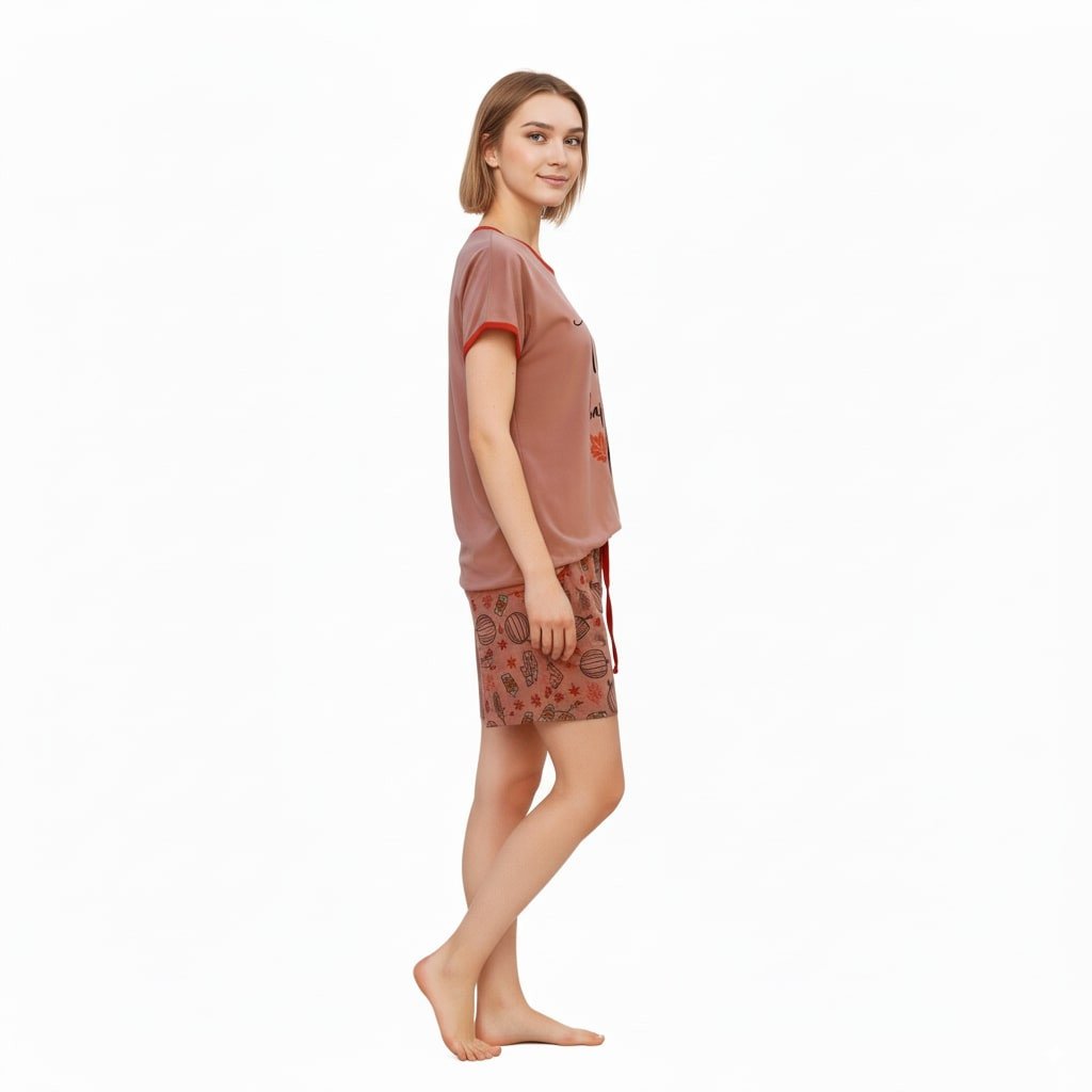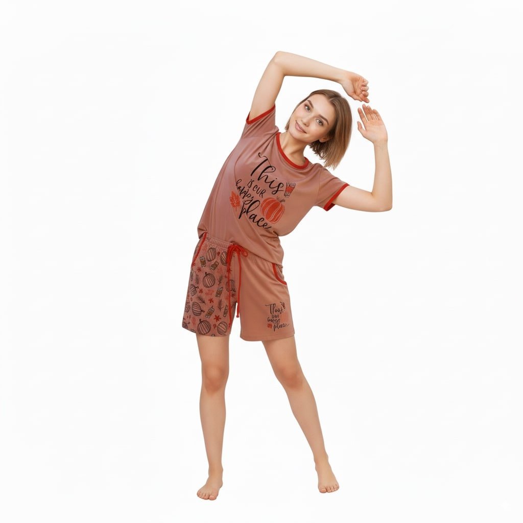 Crafted from soft, breathable cotton, this adorable set features a relaxed-fit top with playful prints and inspiring typography – “This is our happy place”. The set includes coordinating shorts with charming seasonal illustrations like pumpkins, leaves, and coffee cups, adding a touch of whimsy to your downtime. A contrasting neckline and sleeve trim, paired with an adjustable drawstring waistband, ensure a flattering fit with a cute pop of color.